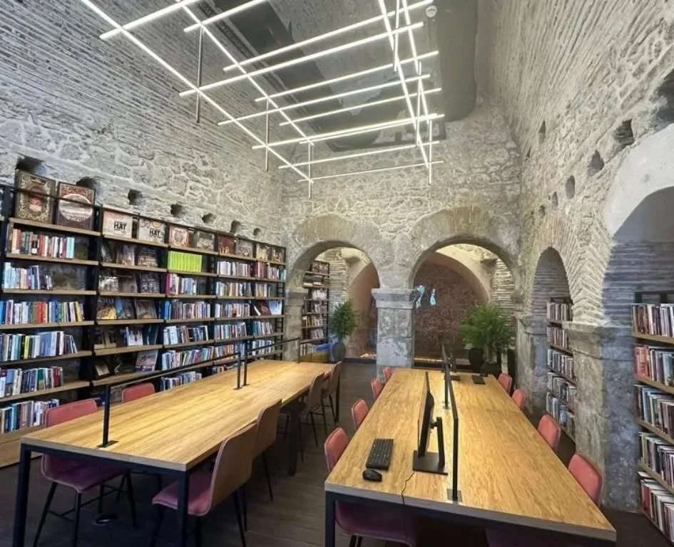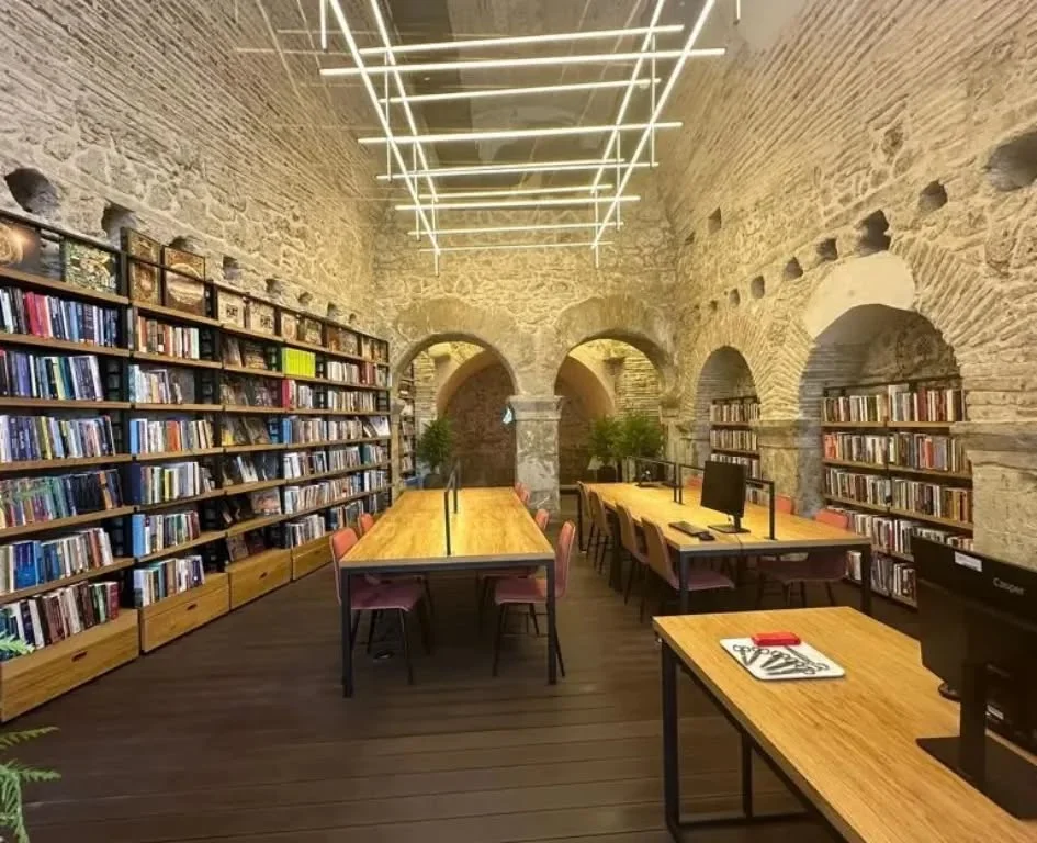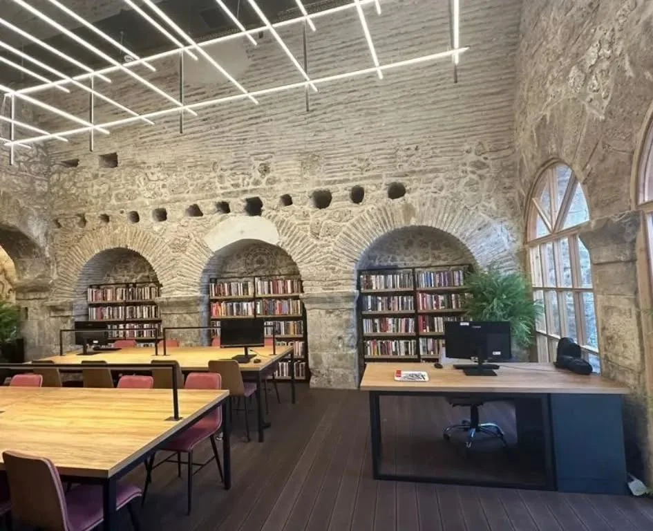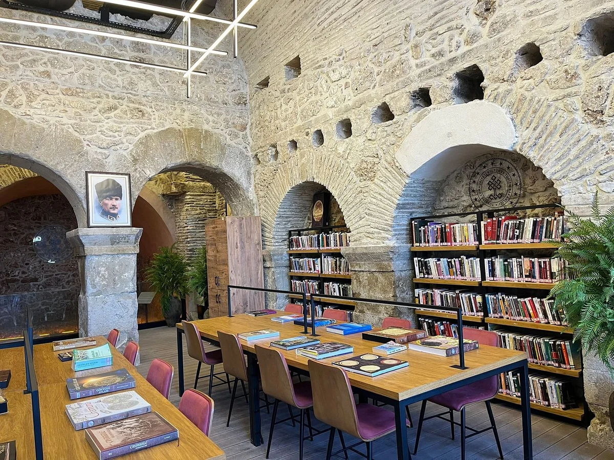Bu resim, Side'deki kütüphanenin tarihi taş duvarları içinde modern bir araştırma ve öğrenme alanı sunduğunu gösteriyor! Tarih ve modernliğin buluştuğu bu mekan, Antalya'nın kültür turizmi zenginliğine katkı sağlıyor.