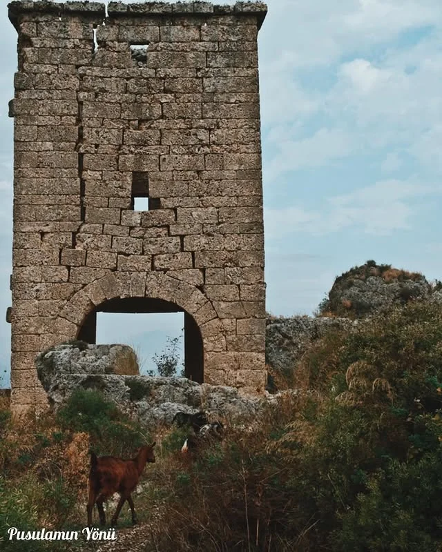 Sillyon Antik Kenti'nin bu farklı perspektifi, tarihi yapılarının ihtişamını ve doğal çevresiyle olan etkileşimini sergiliyor. Eski kule yapısı ve çevresinde gezen keçi, bu arkeolojik alanın canlı tarihini simgeliyor.