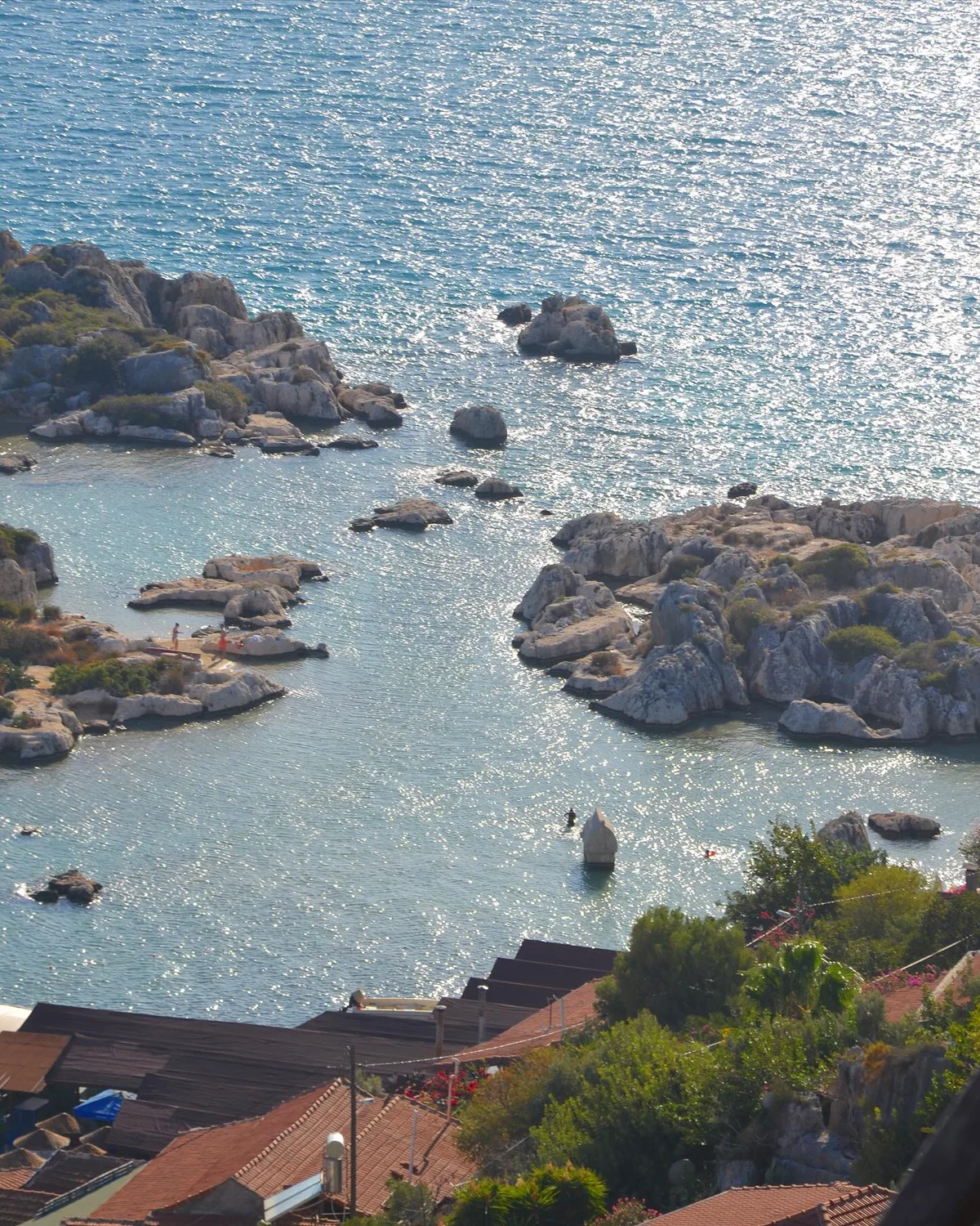 Simena Antik Kenti'nin sakin deniz manzarası, ziyaretçilere huzur dolu bir atmosfer sunuyor. Antalya'nın bu eşsiz turizm destinasyonu, güneş ışıklarının parladığı mavi sularla çevrili.