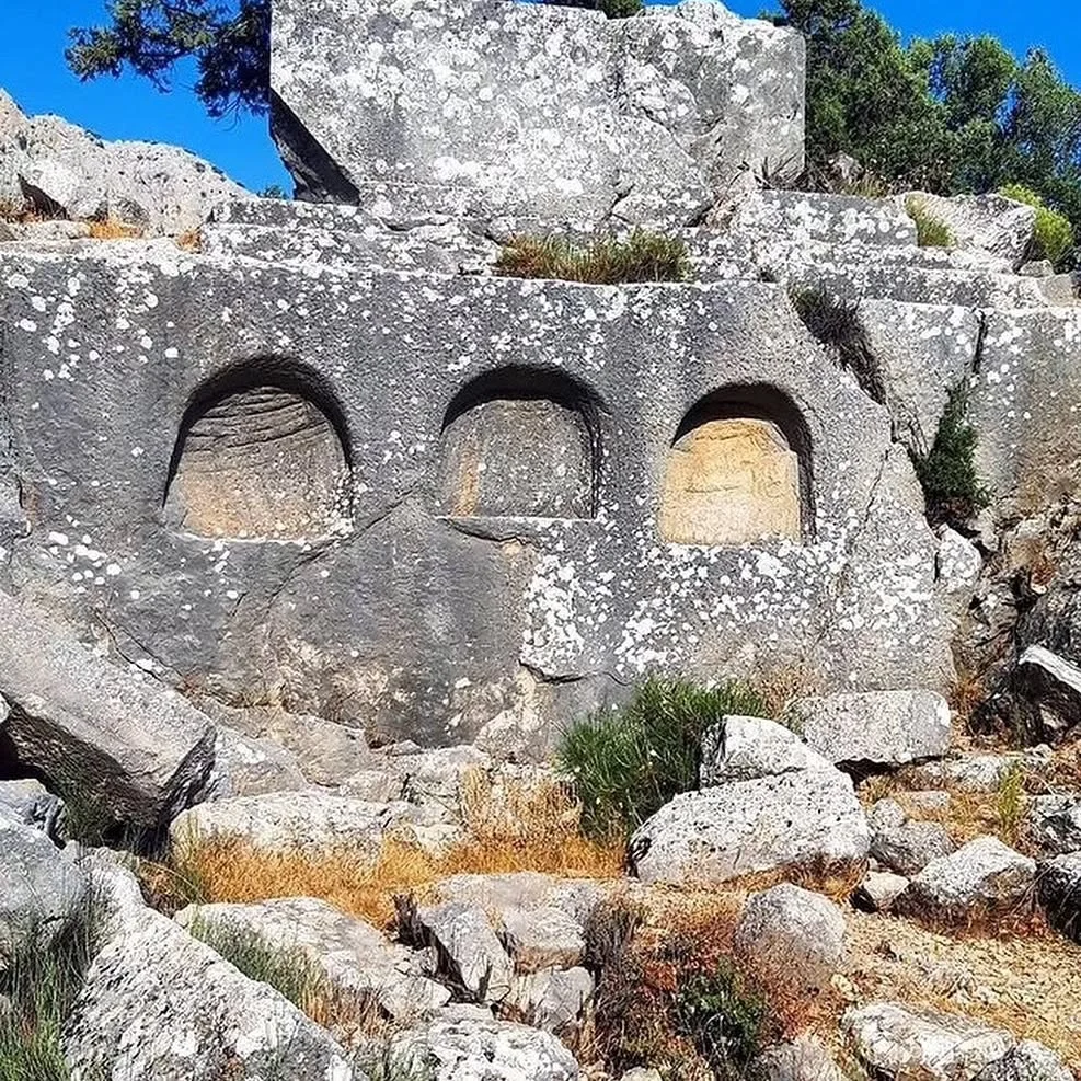 Termessos Antik Kenti'nin kaya nişleri, doğal güzelliklerle çevrili - bu detaylı çekim, büyük kayaya oyulmuş yuvarlak nişlerin yeşil ağaçlar ve mavi gökyüzü eşliğinde nasıl göründüğünü ortaya koyuyor! Antalya'nın kültür turizminde önemli bir yere sahip.