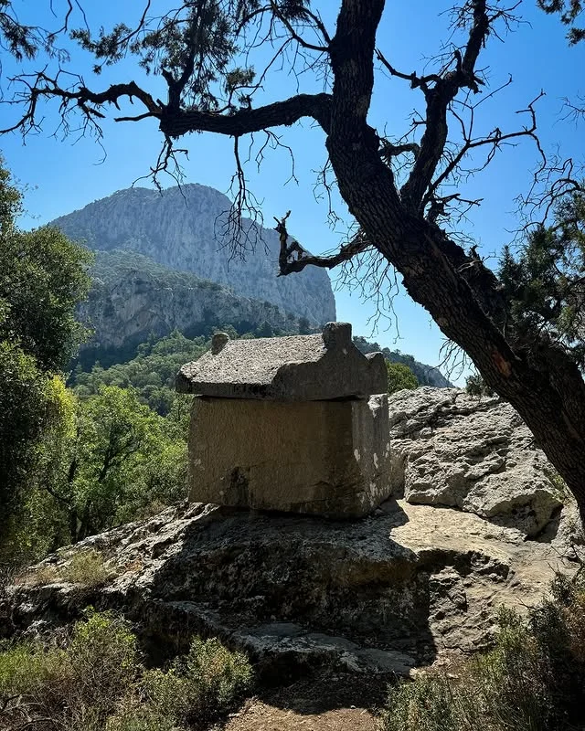 Termessos Antik Kenti, tarihi kalıntıları ve doğal güzellikleriyle dikkat çeken önemli bir arkeolojik alan! Bu resimde, antik taş yapılar arasında yeşilin ve mavi gökyüzünün muhteşem uyumunu görüyoruz. Antalya'nın 30 km kuzeybatısında yer alan bu alan, hem jeolojik hem de kültürel açıdan büyük önem taşıyor.