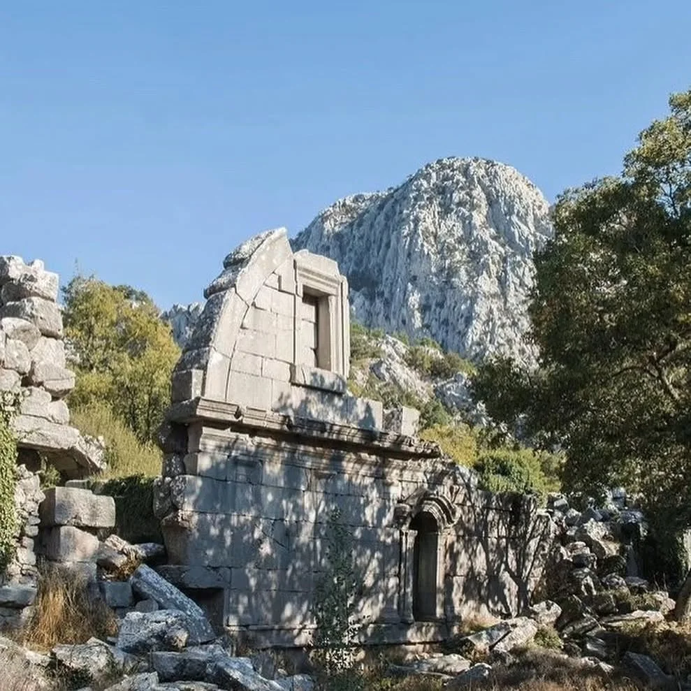 Termessos antik kenti, tarihi yapıları ve doğal güzellikleri ile antik dönemlerin izlerini taşıyan önemli bir arkeolojik alan. Bu resimde, yıkılmış ve ayakta duran taş yapılar arasında, yeşil ağaçların ve açık mavi gökyüzünün huzur verici manzarasını görüyoruz. Antalya'nın doğal sit alanlarından biri olan bu yer, geçmişin izlerini günümüze taşıyor.