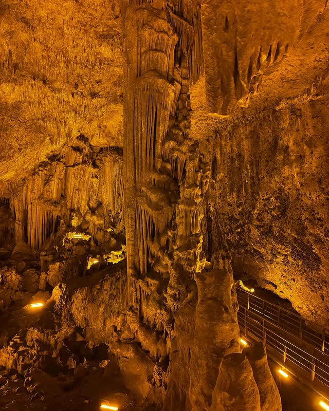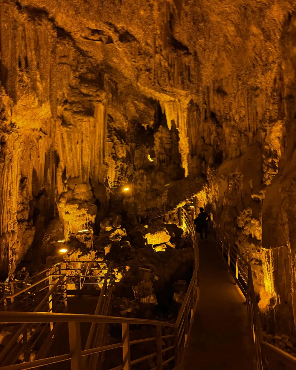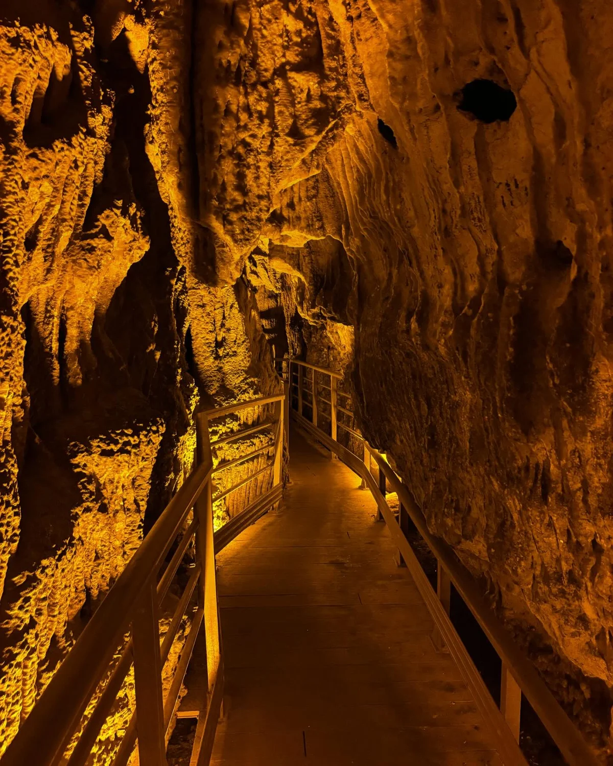 Astım Mağarası'nın bu görüntüsü, sarının sıcak tonlarıyla aydınlatılmış ilginç sarkıt-dikit yapıları ve ziyaretçi yürüyüş yolunu öne çıkarıyor. Mersin'in bu turistik noktası, keşfedilmeyi bekleyen bir doğa harikası!