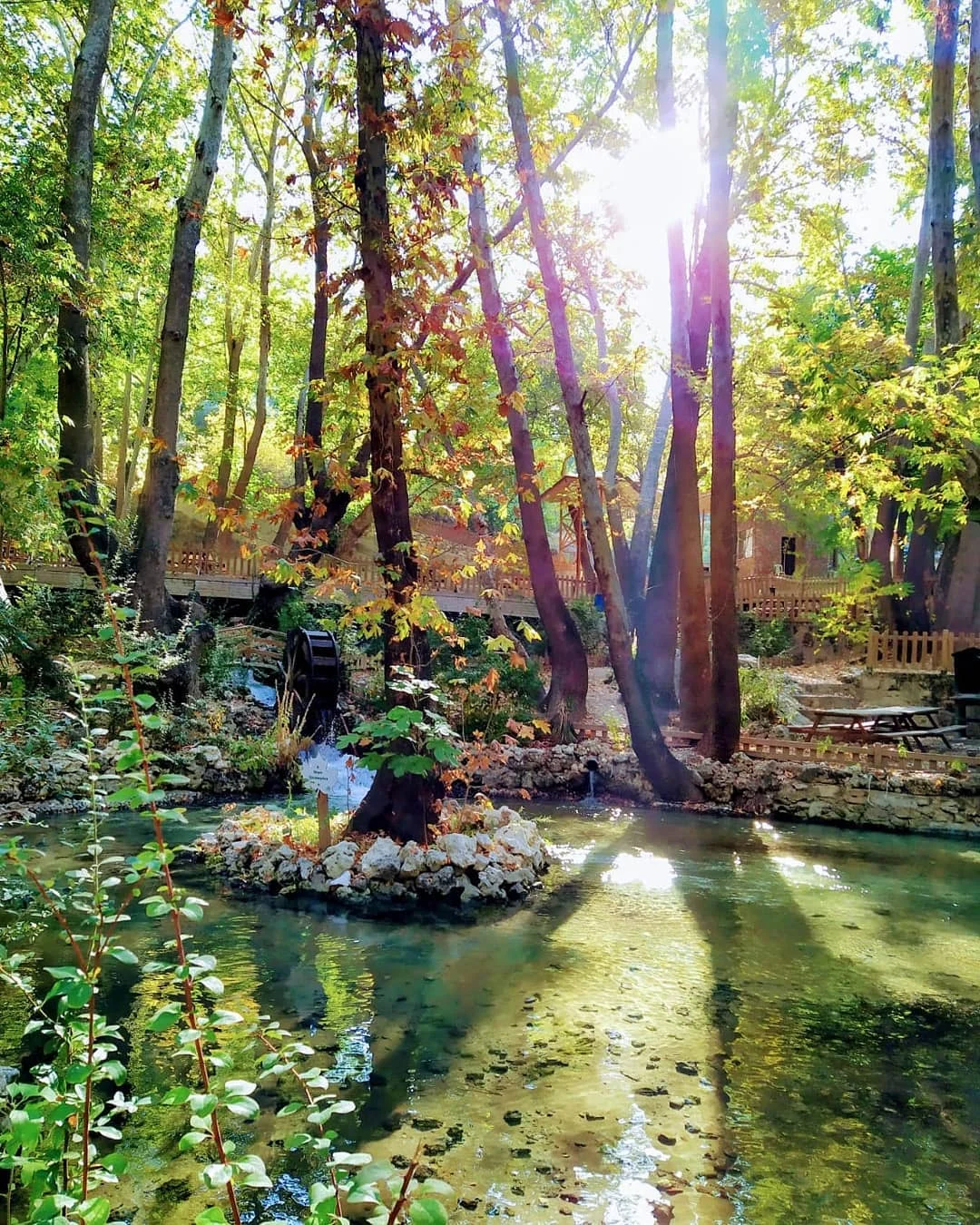 Karaekşi Mesire Alanı, doğal güzellikleri ve huzur veren ortamıyla doğa severler için ideal bir dinlenme noktasıdır. Bu resimde su çarkı ve ahşap yürüyüş yolu, sonbaharın büyüleyici renkleriyle birleşiyor - Mersin'in Mut ilçesine sadece 7 km uzaklıkta!