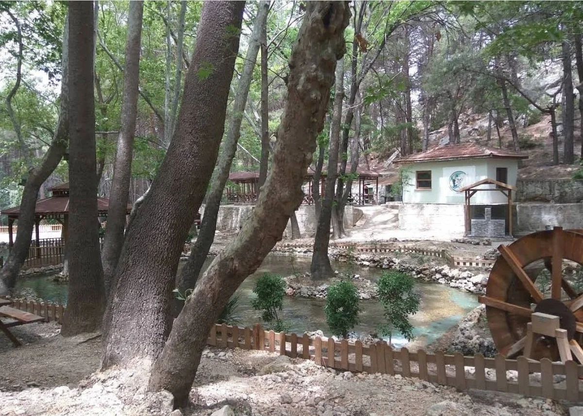 Karaekşi Mesire Alanı'nın bu detaylı görüntüsü, yemyeşil ağaçlar arasında bir su göleti ve su değirmeni tekerleği ile doğanın huzurunu yaşatıyor. Mersin'de doğa ile iç içe vakit geçirmek isteyenler için mükemmel bir mekan!