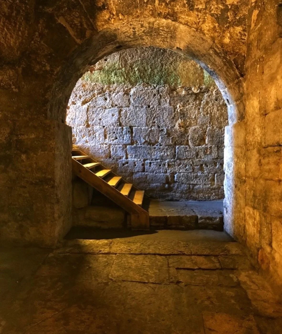 Aya Thekla Manastırı'nın gizemli mahzeni, taş duvarlar ve yuvarlak kemerlerle büyüleyici bir atmosfer sunuyor! Ahşap merdivenler, tarihi bir yolculuğa davet ediyor.