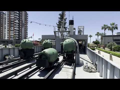 Nusrat mayın gemisi, modern yapılarla çevrili dinlendirici bir atmosfer sunarak deniz turizminin keyfini çıkarıyor. Bu resimde, gemi su kenarında demirlemiş, arka planda apartmanlar ve palmiyelerle birlikte huzurlu bir manzara sunuyor. Tarsus'ta yer alan bu tarihi eser, modern yaşamla tarihin buluşma noktası!