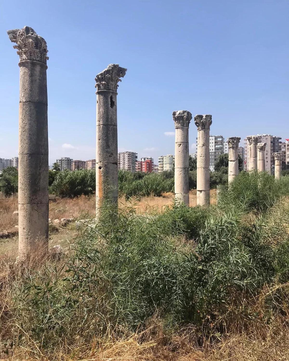 Soli Pompeipolis Antik Kenti, tarih ve modern yaşamın iç içe geçtiği eşsiz bir arkeolojik alan sunar. Bu detaylı çekim, antik sütunların çevresindeki yeşil alanları ve modern şehir manzarasını bir araya getiriyor - Mersin'de kültür turizmi için ideal!