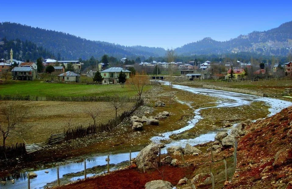 Yemyeşil dağların arasında akmakta olan dere, doğanın huzur verici melodisini oluşturuyor. Derenin etrafındaki taşlar ve ağaçlar, manzaraya doğallık katıyor. Arka planda görülen köy evleri, doğanın kollarında huzurlu bir yaşam sunuyor. Bu manzara, doğa yürüyüşleri ve dinlenme için etkileyici bir ortam sunuyor.