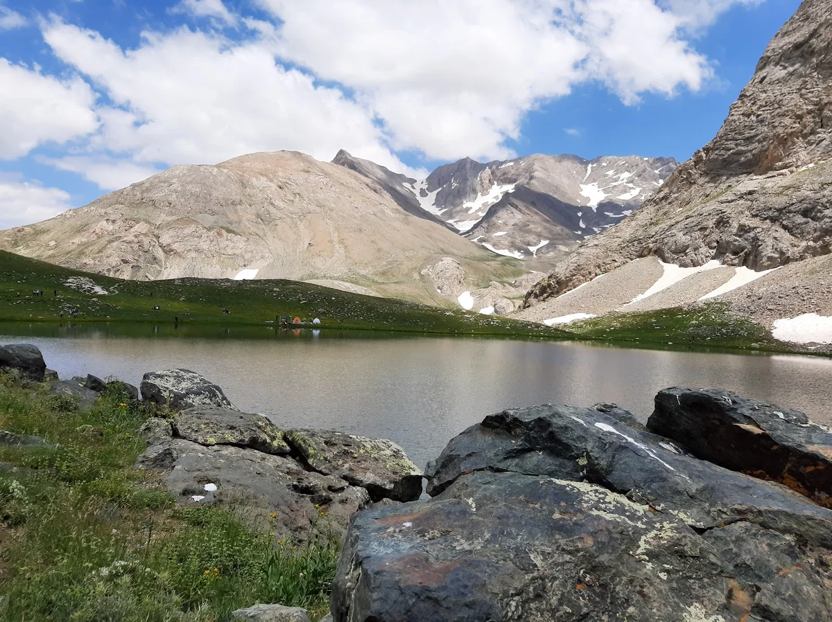 Dağlarla çevrili bir gölün kıyısında dururken, doğanın büyüleyici güzelliği karşısında hayran kalıyorsunuz. Gölün yüzeyinde yansıyan dağların ihtişamı, manzaranın derinliğini artırıyor. Göl kıyısındaki büyük taşlar ve çimenler arasında açan sarı çiçekler, bu doğal güzelliği tamamlıyor. Uzakta görülen kamp çadırları, doğayla iç içe bir deneyim yaşamak isteyenleri ağırlıyor. Burada, huzur ve dinginlik içinde, doğanın kollarında kaybolmanın keyfini çıkarıyorsunuz.