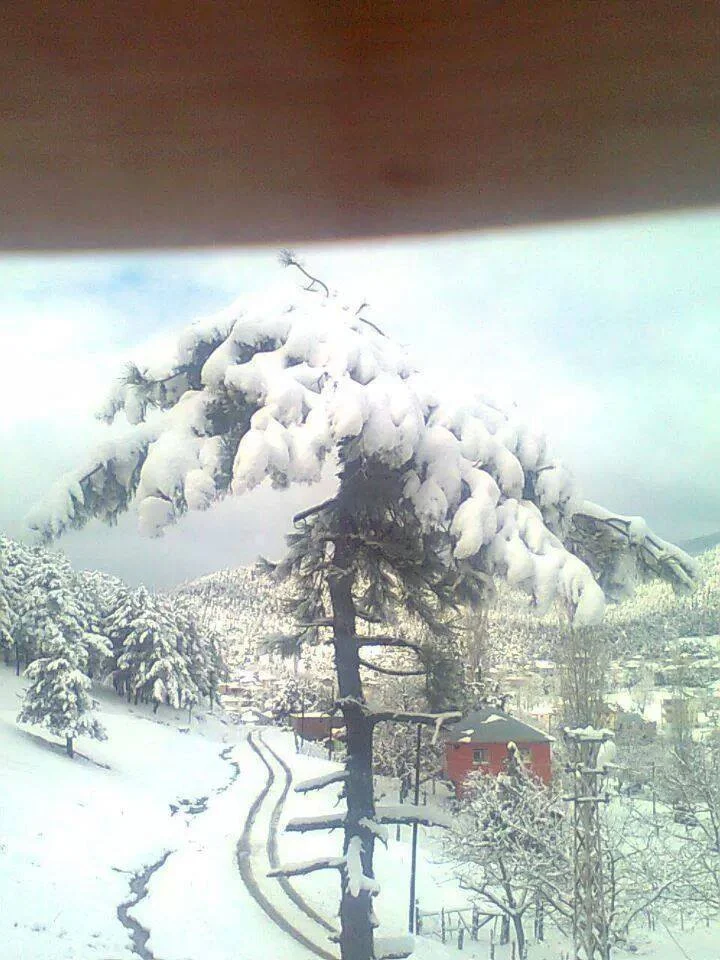 Yoğun kar yağışı sonrası beyaz örtüyle kaplı zemin ve ağaçlar, soğuk havanın etkisini yansıtıyor. Arka planda görülen karla kaplı çam ağaçları, doğanın sunduğu zarif güzellikleri gözler önüne seriyor. Bu sakin ve huzurlu kış manzarası, doğanın büyüleyici atmosferini keşfetmek isteyenler için ideal bir ortam sunuyor.
