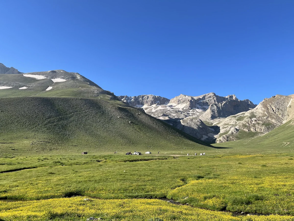Yüksek dağ silsilesinin sarp yamaçları ve karla kaplı zirveleri arasındaki yemyeşil vadi, göz kamaştırıcı bir manzara sunuyor. Vadi içindeki sarı çiçeklerle kaplı alanlar, doğanın rengarenk paletini sergiliyor. Bu alanda, dağınık şekilde yerleştirilmiş yapılar ve hayvanlar, doğanın ve insan yaşamının uyum içinde olduğunu gösteriyor. Gökyüzünün açık mavi tonları, bu huzur verici atmosfere ferahlık katıyor. Doğa ile baş başa kalmanın verdiği huzur, adımlarınızı daha da hafifletiyor.