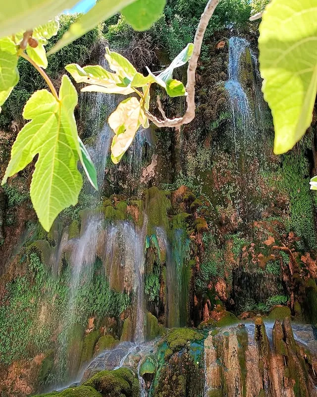 Yeşil bitkilerle kaplı kayalarda akan ince şelaleler ve sakin su birikintisi.