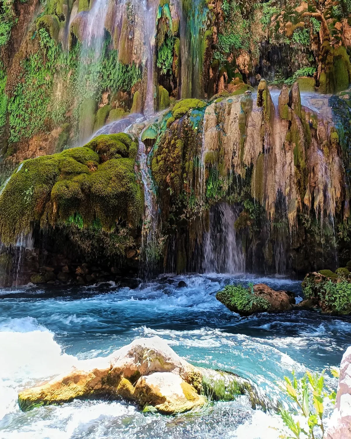 Görüyor musunuz, şelalelerin akışı nasıl da büyüleyici? Bu noktada, suyun kayalardan süzülüşü ve çevredeki bitki örtüsüyle birleşerek eşsiz bir atmosfer yaratıyor. Doğanın gücü ve güzelliği burada birleşiyor. Yaklaşık 10 şelale bulunur.