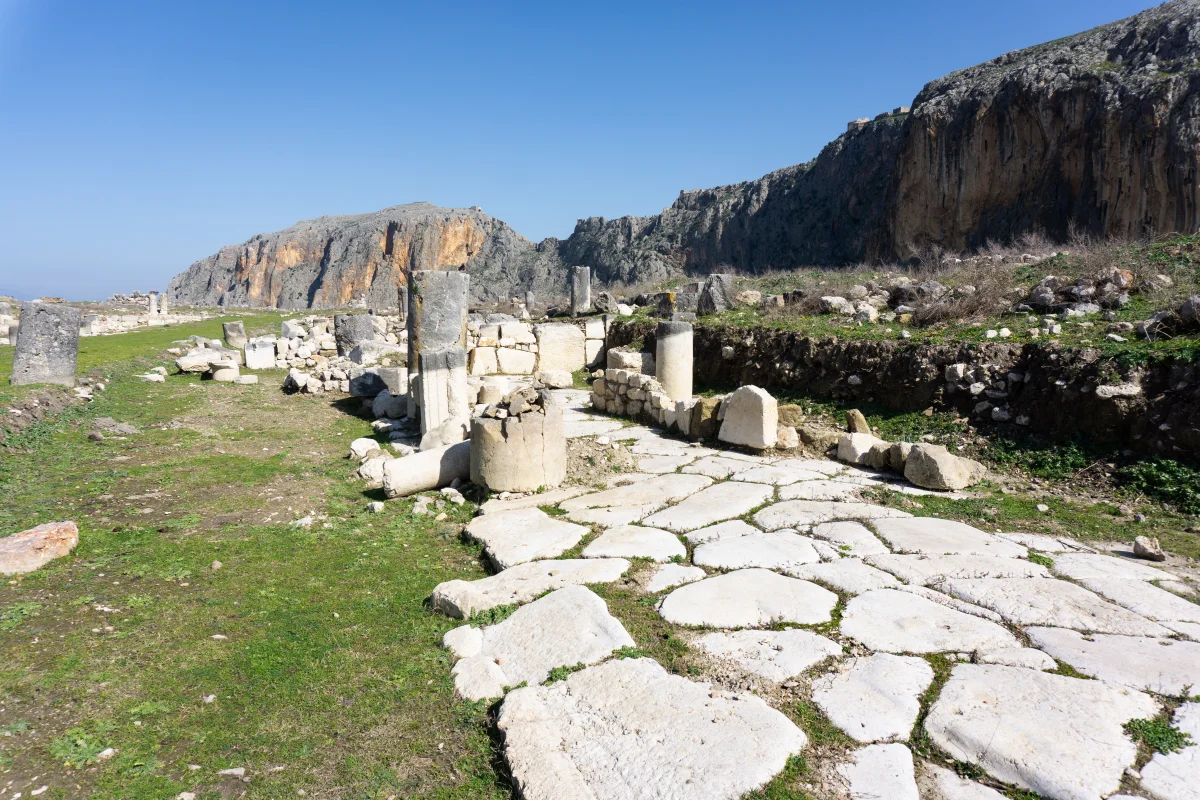 Anavarza’nın kalıntıları arasında ilerlerken, zeminde büyük taşlardan oluşmuş bir yol ve çevresinde sıralanan yuvarlak sütunlar dikkat çekiyor. Bu sütunlar, kentin geçmişteki ihtişamını yansıtıyor. Arka plandaki kayalık dağ sırası, gökyüzünün maviliğiyle birleşerek tarihi ve doğal bir yapı sunuyor. Kilikya’daki tek örnek olan üç girişli zafer takı ve sütunlu yol, şehrin antik dönemlerdeki önemini hatırlatıyor.