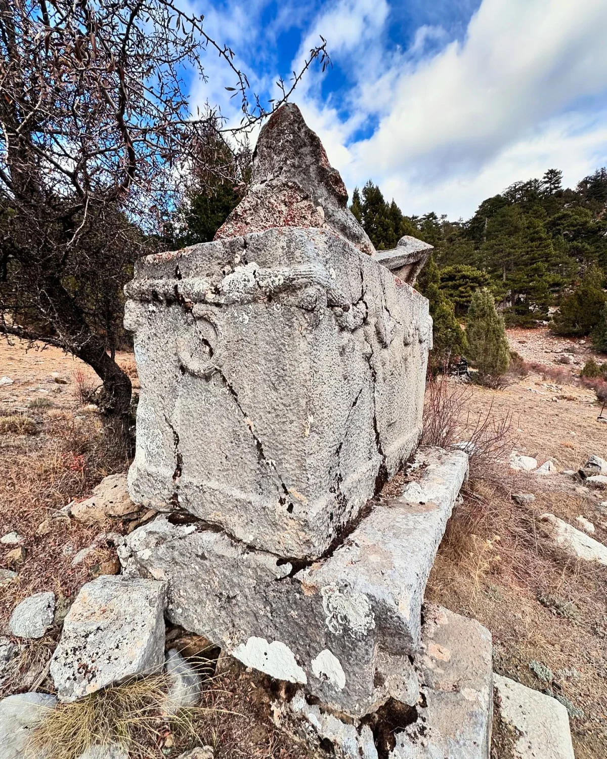 Üzerinde insan figürü işlenmiş bu büyük taş mezar, Balboura'nın ölü kültürünün önemli bir örneği. Kapaklarında aslan figürleri bulunan mezarlarla birlikte, kentin Mausoleion kalıntıları arasında yer alıyor. Bu anıt, Roma döneminde yaşamış önemli bir kişinin ebedi istirahatgahı. Taş üzerindeki detaylı işçilik, antik heykeltıraşların ustalığını gösteriyor. Her çizgi, geçmişin büyük insanlarının anısını yaşatmaya devam ediyor.