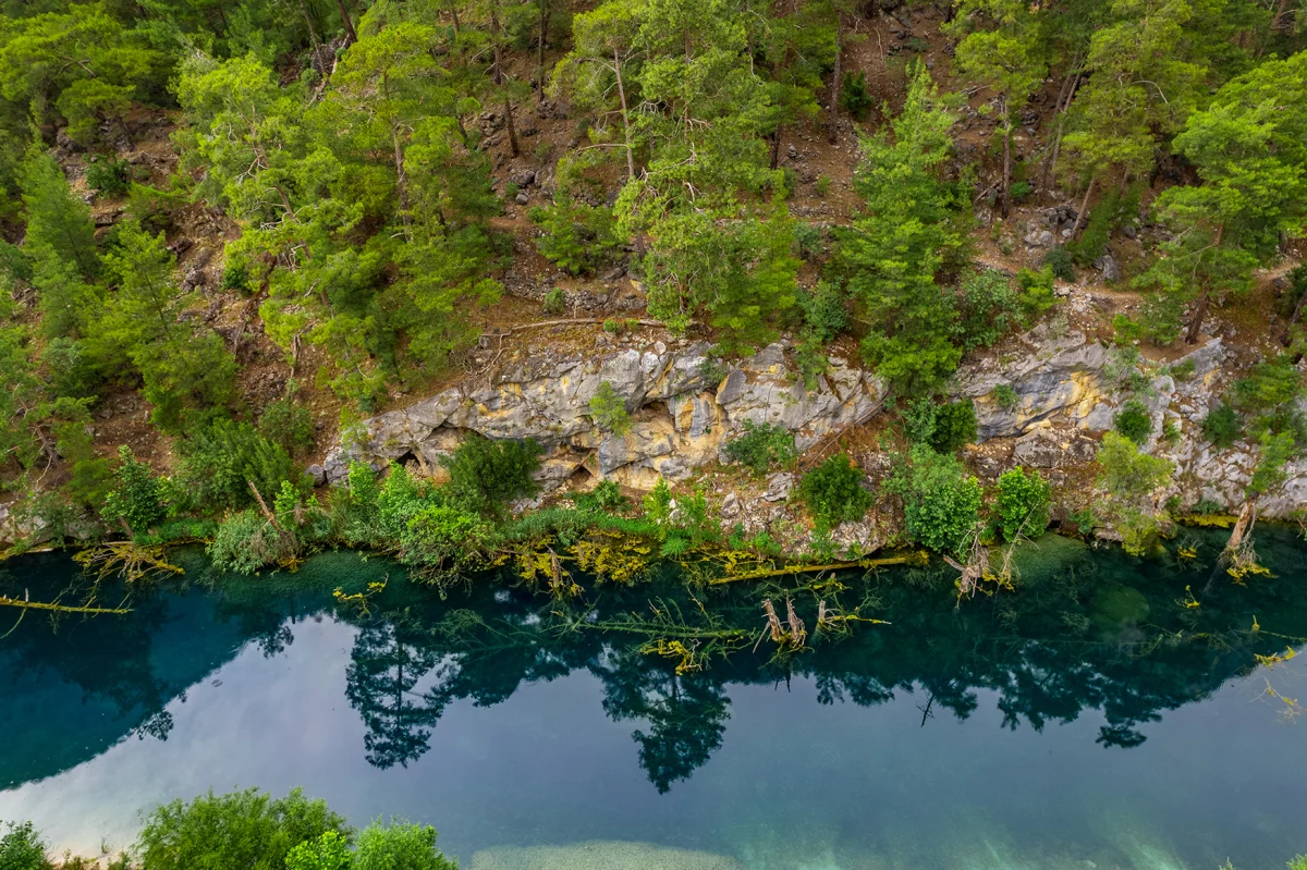 Yemyeşil ormanın kalbinde, sakin su kaynağı mavi tonlarında parıldıyor. Ağaçların yansımaları suda dans ederken, çevredeki sedir ve meşe ağaçları gölge yapıyor. Bu huzurlu köşe, doğaseverlerin dinlenme noktası. Berrak suyun kenarında, kuş seslerini dinleyerek meditasyon yapabilirsiniz. Kanyonun en sakin bölgelerinden biri olan bu alan, ruhunuzu dinlendirecek.