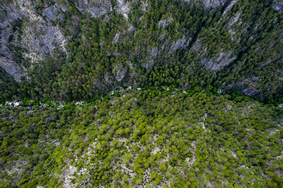 Birbirine dolanmış dağ sıraları, derin vadilerle kesiliyor. Kayalık ve ormanlık alanların oluşturduğu mozaik, jeolojik oluşumların muhteşem örneği. Arka plandaki zirveler, kanyonun ne kadar geniş bir alana yayıldığını gösteriyor. Bu doğal labirent, her köşesinde farklı bir sürpriz barındırıyor. Yürüyüş rotalarında, bu eşsiz coğrafyanın tadını çıkarabilirsiniz.