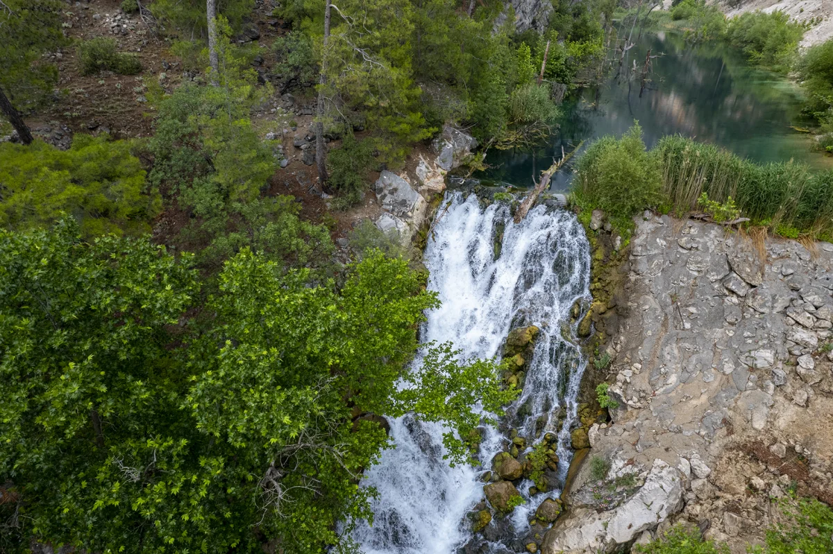 Kayaların üzerinden dökülen su, beyaz köpükler halinde aşağıya süzülüyor. Şelalenin çevresindeki yoğun yeşillik ve ağaçlar, doğal bir çerçeve oluşturuyor. Bu görüntü, kanyonun su zenginliğinin en güzel örneği. Çam ve sedir ağaçlarının gölgesinde, şelalenin sesini dinlemek huzur veriyor. Doğanın bu muhteşem eseri, her mevsim farklı güzellikler sunuyor.