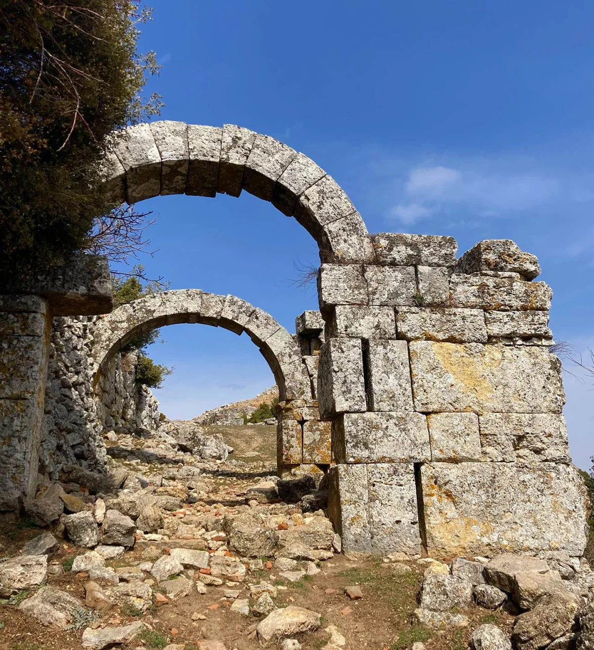 Yeşil tepe ve bulutlu gökyüzü altında yer alan bu kemerli yapı, Kremna'nın doğal güzellikler içindeki konumunu vurguluyor. Aksu Vadisi'ndeki bu hâkim konum, kentin savunma açısından stratejik önemini ortaya koyuyor. Antik mimarlar, hem güvenlik hem de estetik kaygılarla bu lokasyonu seçmiş. Doğa ve tarih burada el ele vermiş.