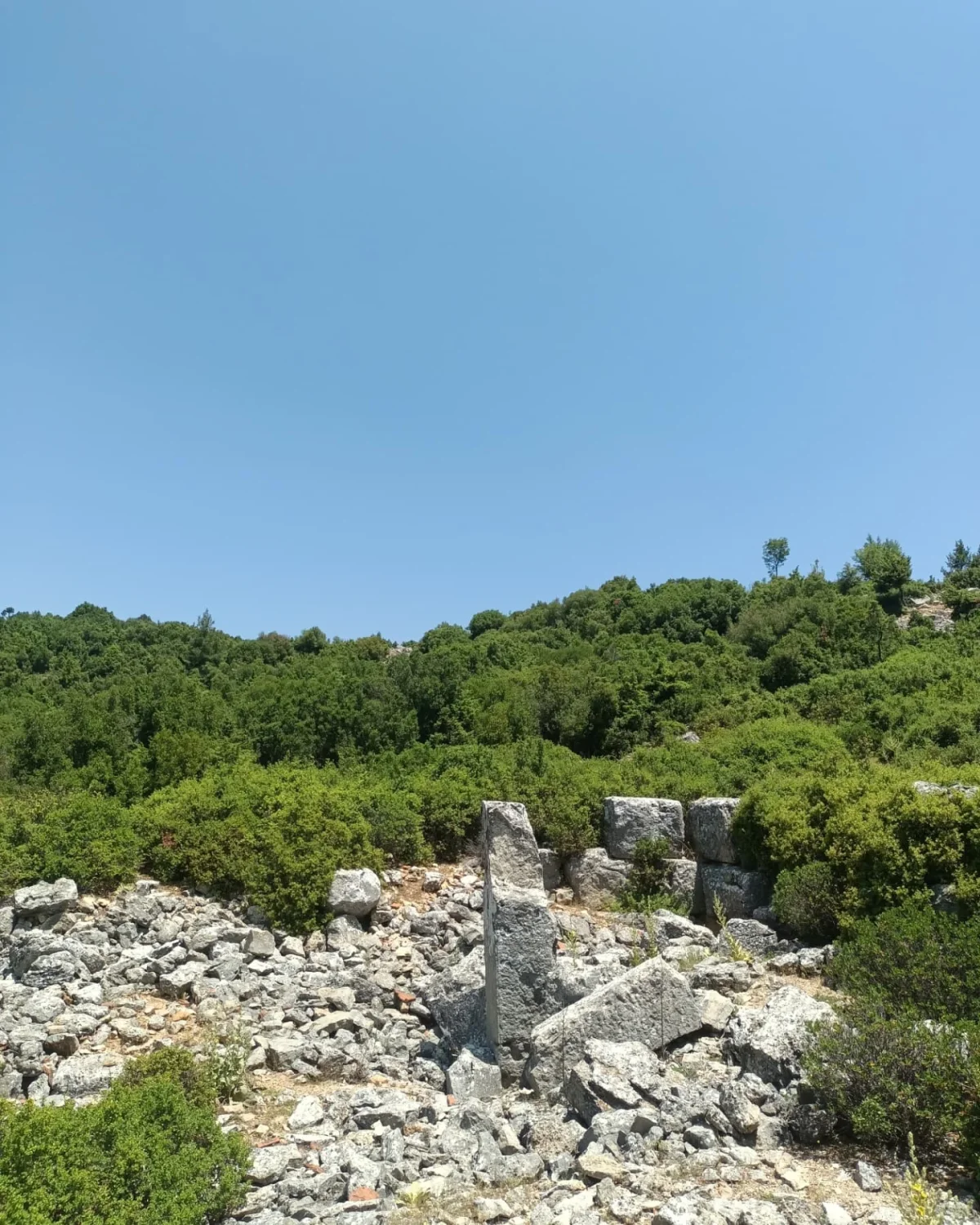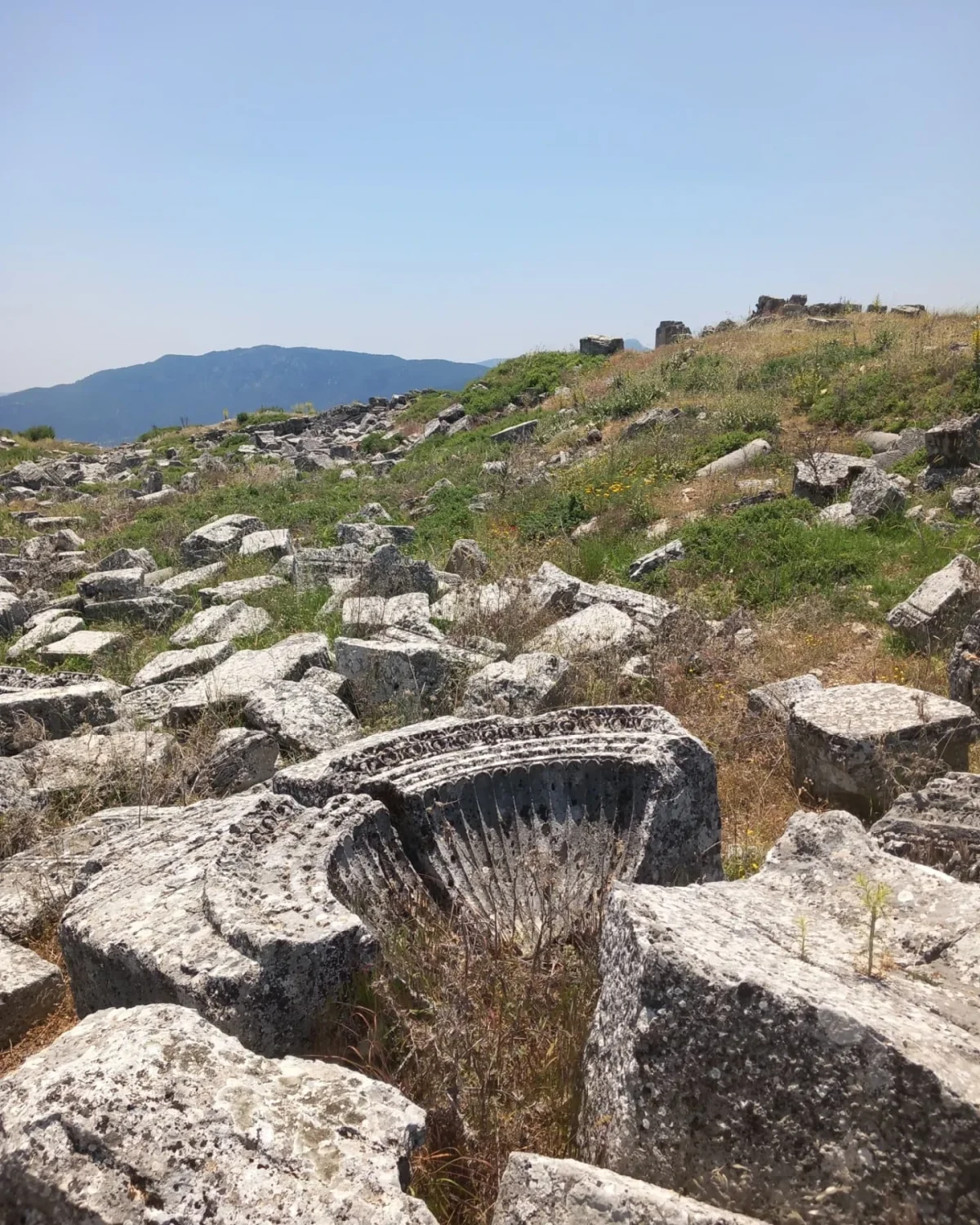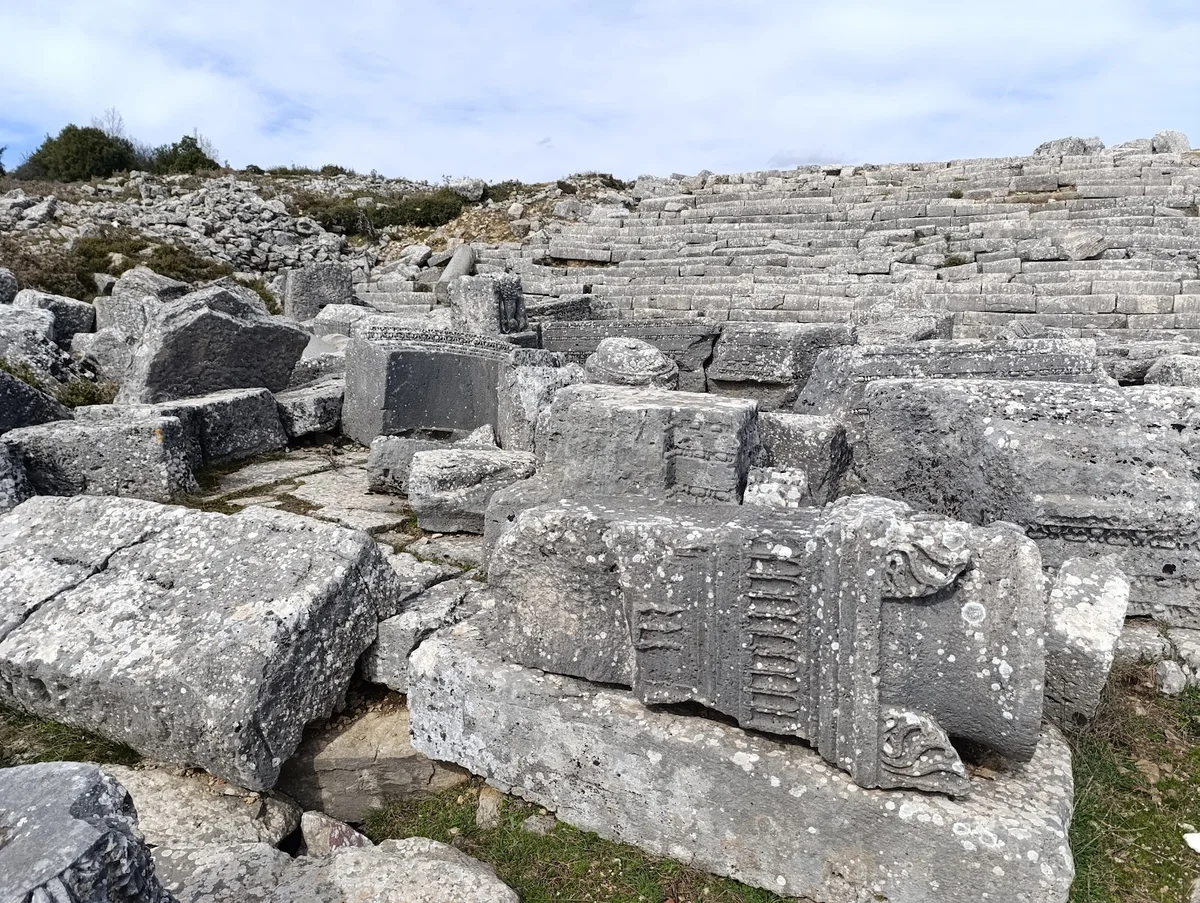 Sık bitki örtüsü arasında yer alan bu büyük taş bloklar, Kremna'nın doğayla iç içe geçmiş halini gösteriyor. Ön plandaki detaylı işçiliğe sahip yuvarlak taş parça, muhtemelen bir sütun başlığı veya süsleme elemanı. Böyle parçalar, kentin bir zamanlar ne kadar görkemli olduğunu kanıtlıyor. Doğa, tarihi koruyarak sarmalamış.