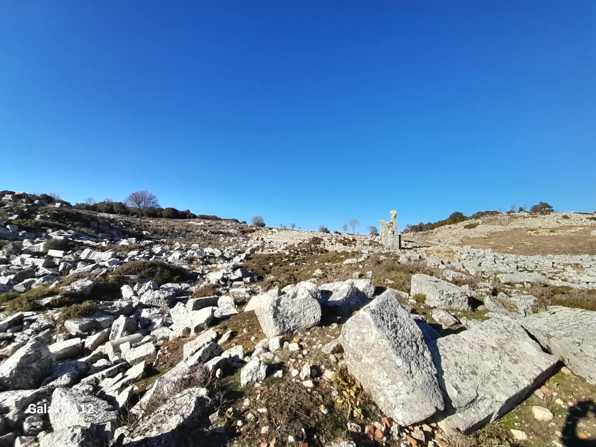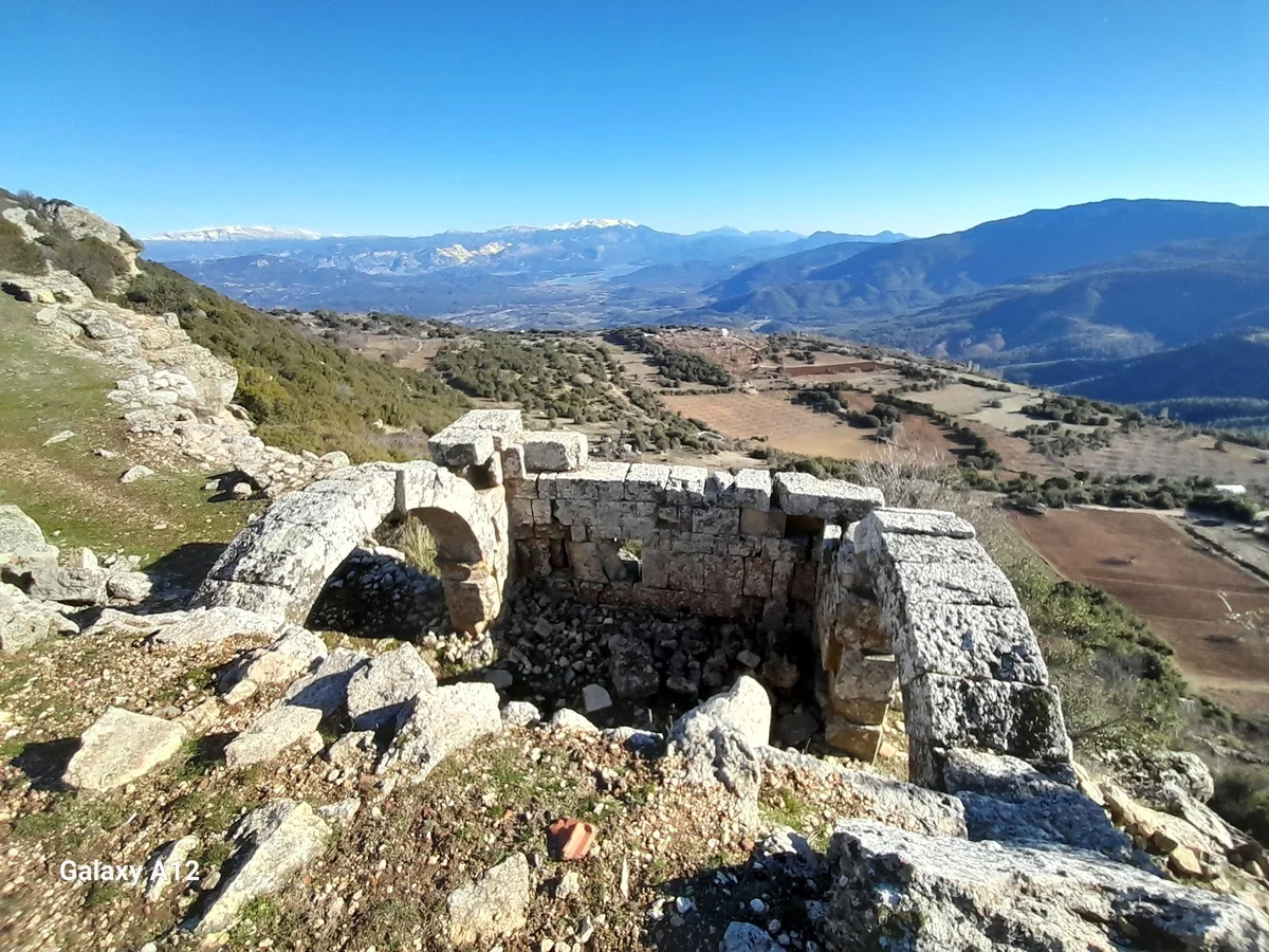 Taşlarla kaplı engebeli arazi üzerinde, uzakta düzgün taşlardan yapılmış yapı kalıntıları ve anıtsal bir eser görülüyor. Bu görüntü, Kremna'nın geniş alana yayılmış kent yapısını ortaya koyuyor. Roma kolonisinin farklı bölgelerinde çeşitli yapılar yer alırdı. Her kalıntı, antik kentin büyüklüğü ve önemini kanıtlayan birer delil.