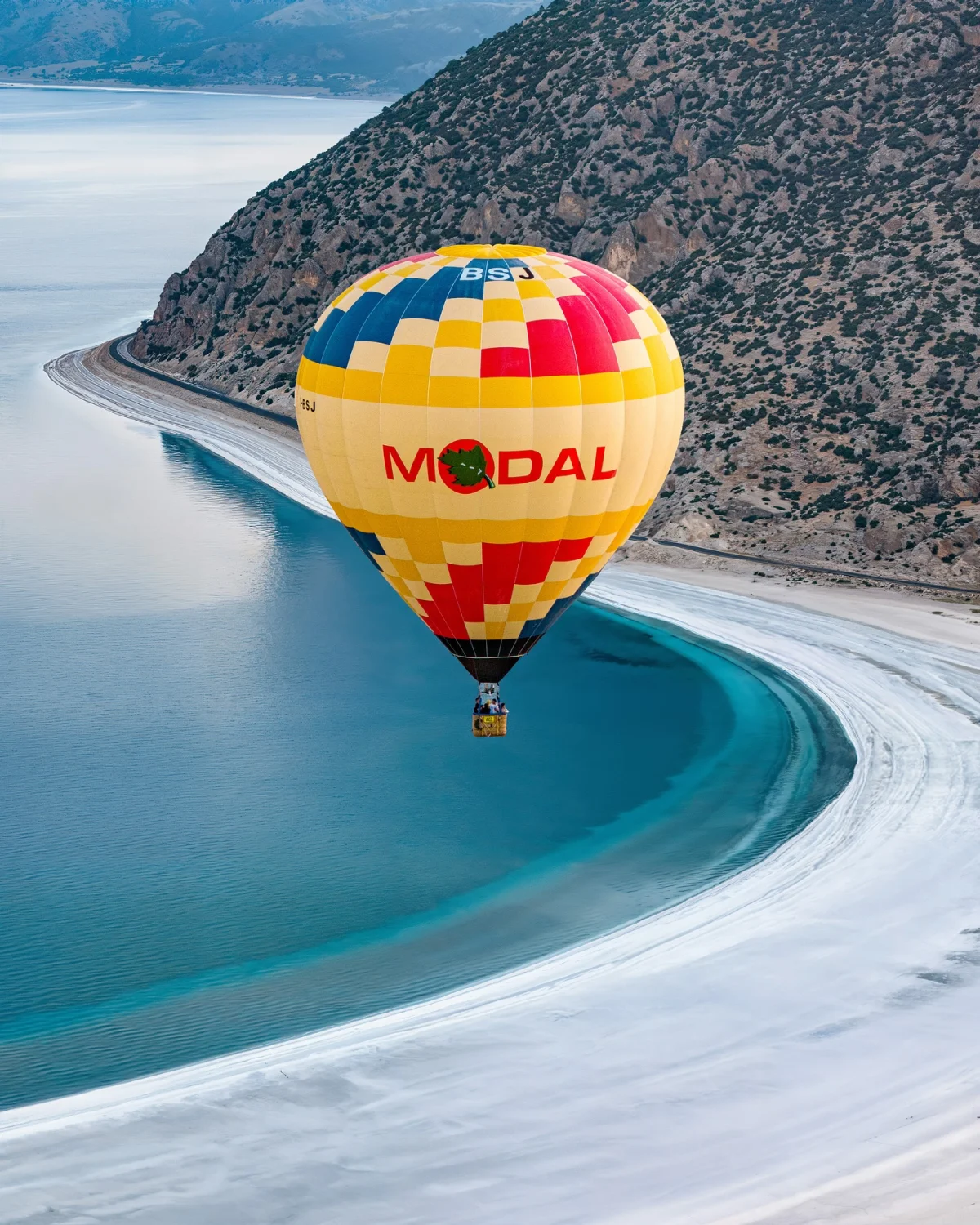 Sarı, kırmızı ve mavi desenli sıcak hava balonu, mavi-turkuaz renkli göl üzerinde süzülüyor. Havadan bakıldığında gölün gerçek büyüklüğü ve güzelliği daha net görülüyor. Bu eşsiz deneyim, gölün 44 km² yüzölçümünü kuşbakışı keşfetme imkânı sunuyor. Rüzgâr sörfü aktiviteleri için ideal olan göl, aynı zamanda hava sporları için de mükemmel koşullar sağlıyor. Gökyüzünden bu cenneti seyretmenin tadını çıkarın.