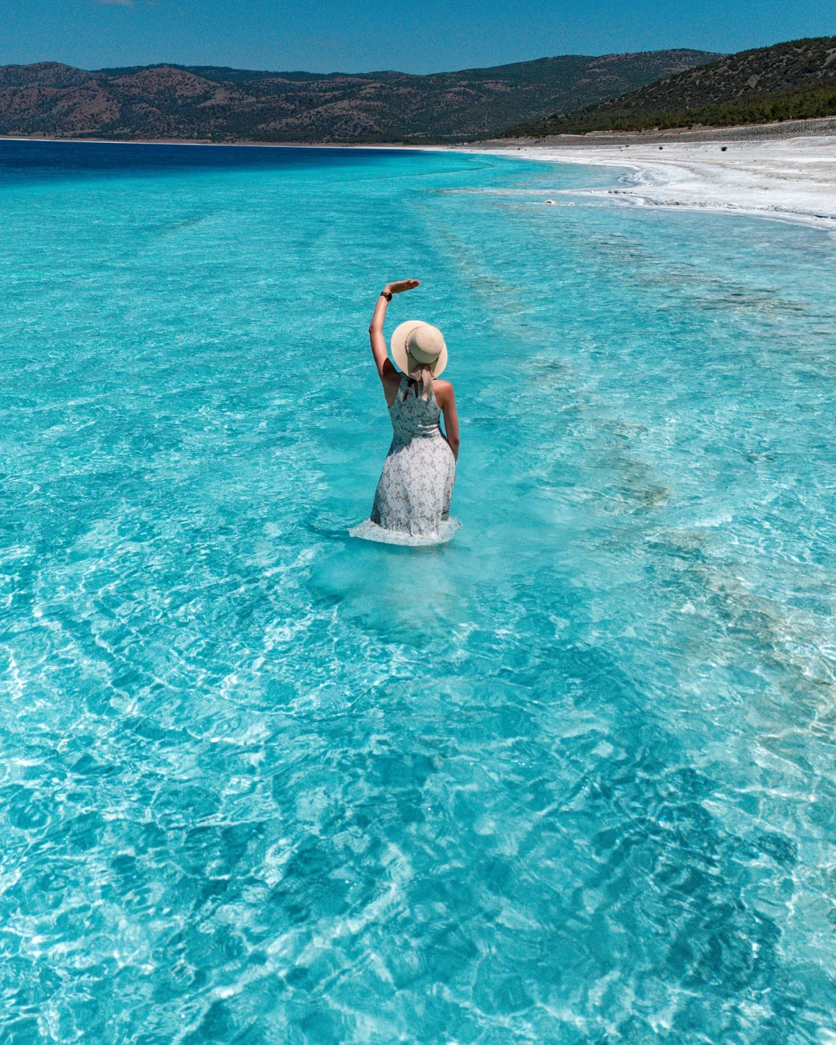 Beyaz elbise ve şapkalı kadının berrak mavi sularda durması, gölün yüzme aktiviteleri için mükemmel olduğunu gösteriyor. Suyun içinde rahatça durabilmek, gölün sakin yapısını kanıtlıyor. Magnezyum açısından zengin su, cildinize doğal mineral bakım sağlıyor. Yüzme, dalış ve su sporları için ideal koşullar sunan bu cennet, sağlıklı tatil deneyimi yaşatıyor. Temiz sularında ferahlatıcı yüzüşler yapın.