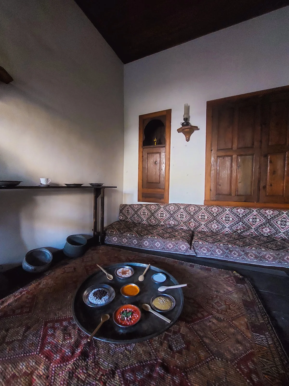 Sade ve açık renkli duvarlarla kaplı mekanda, ahşap detaylar öne çıkıyor. Ortadaki büyük yuvarlak tepsi, geleneksel oturma düzeninin merkezinde yer alıyor. Bu alan, Osmanlı döneminin sosyal yaşamını yansıtıyor. Ahşap işçiliği, dönemin sanat anlayışını gösteriyor. Geleneksel oturma kültürü, bu düzende yaşıyor. Sıcak ve davetkar bir ortam sunuyor.