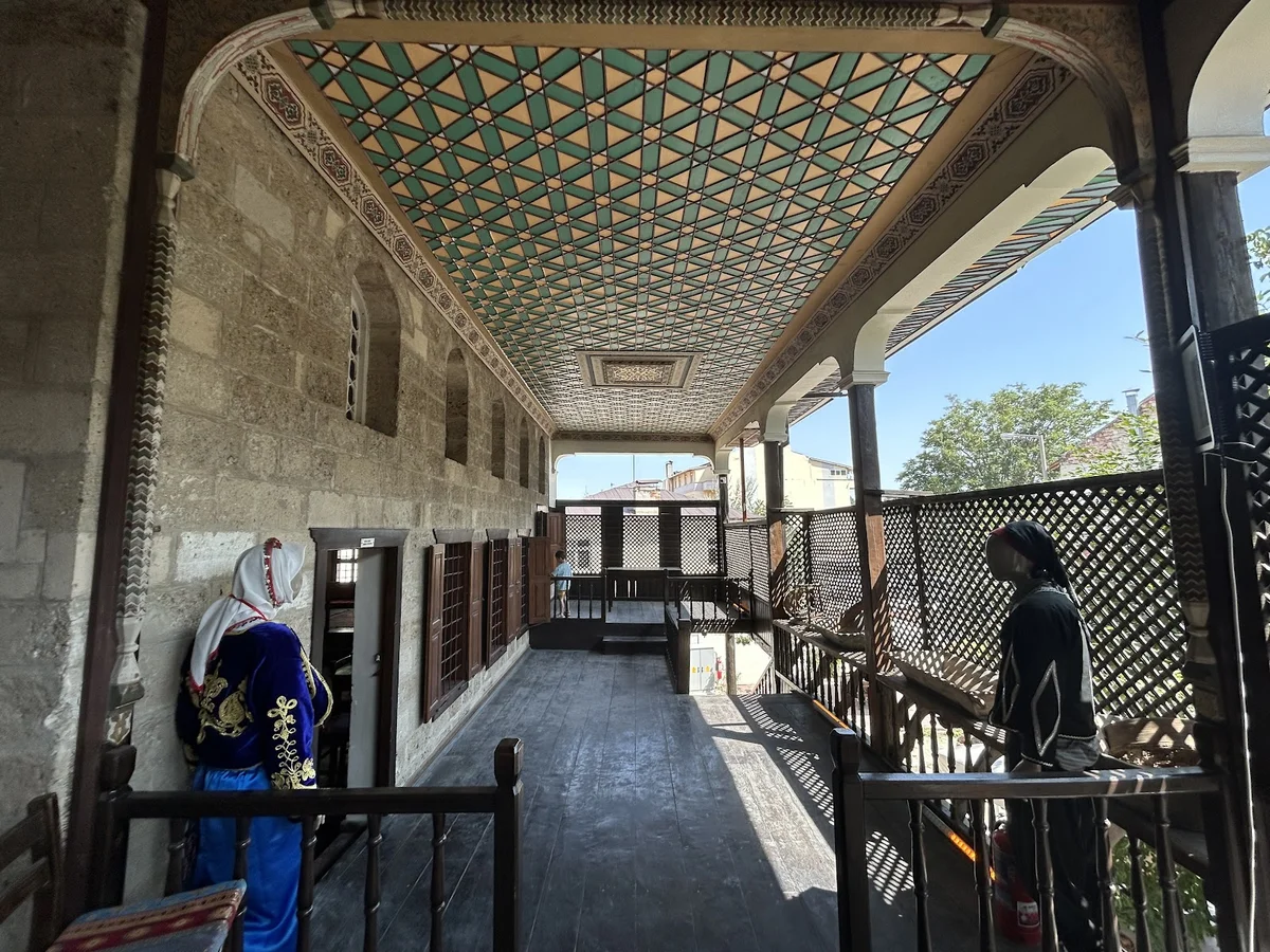 Konağın üst kısmındaki balkon, ahşap ve ince detaylarla süslenmiş yapısıyla göz dolduruyor. Geleneksel mimari unsurlar, dönemin estetik anlayışını sergiliyor. Zemin kattaki taş temeller, üst kattaki ahşap detaylarla buluşuyor. Bu balkon, konağın karakteristik özelliklerinden biri. Osmanlı sivil mimarisinin güzel örneği. İncelik ve zarafet, her detayda hissediliyor.