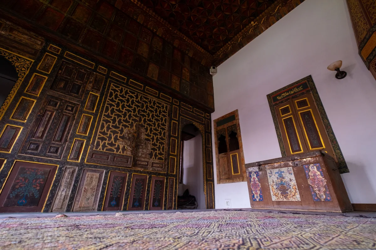 Tavandaki zengin geometrik desenler, konağın sanat değerini gözler önüne seriyor. Ahşap işçiliği ve altın varaklı detaylar, dönemin estetik anlayışını yansıtıyor. Koyu tonlardaki duvarlar, altın işlemelerin parlaklığını artırıyor. Bu oda, konağın en değerli mekanlarından biri. Osmanlı saray sanatının izlerini taşıyor. Her köşesi, ustaca işlenmiş bir sanat eseri.