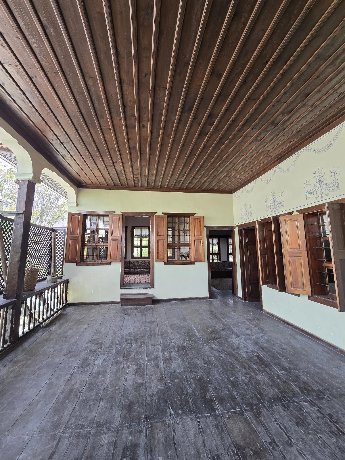Konağın iç avlusunda, taş işçiliği ve ahşap detayların buluştuğu özel bir alan. Renkli geometrik desenlerle süslü tavan, geleneksel Türk sanatının zarafetini yansıtıyor. Bu geniş teras, ailenin günlük yaşamının merkezi olmuş. Duvarlarındaki taş dokular, yapının sağlamlığını gösteriyor. Osmanlı dönemi yaşam tarzının izlerini taşıyan bu mekan, huzur veriyor.