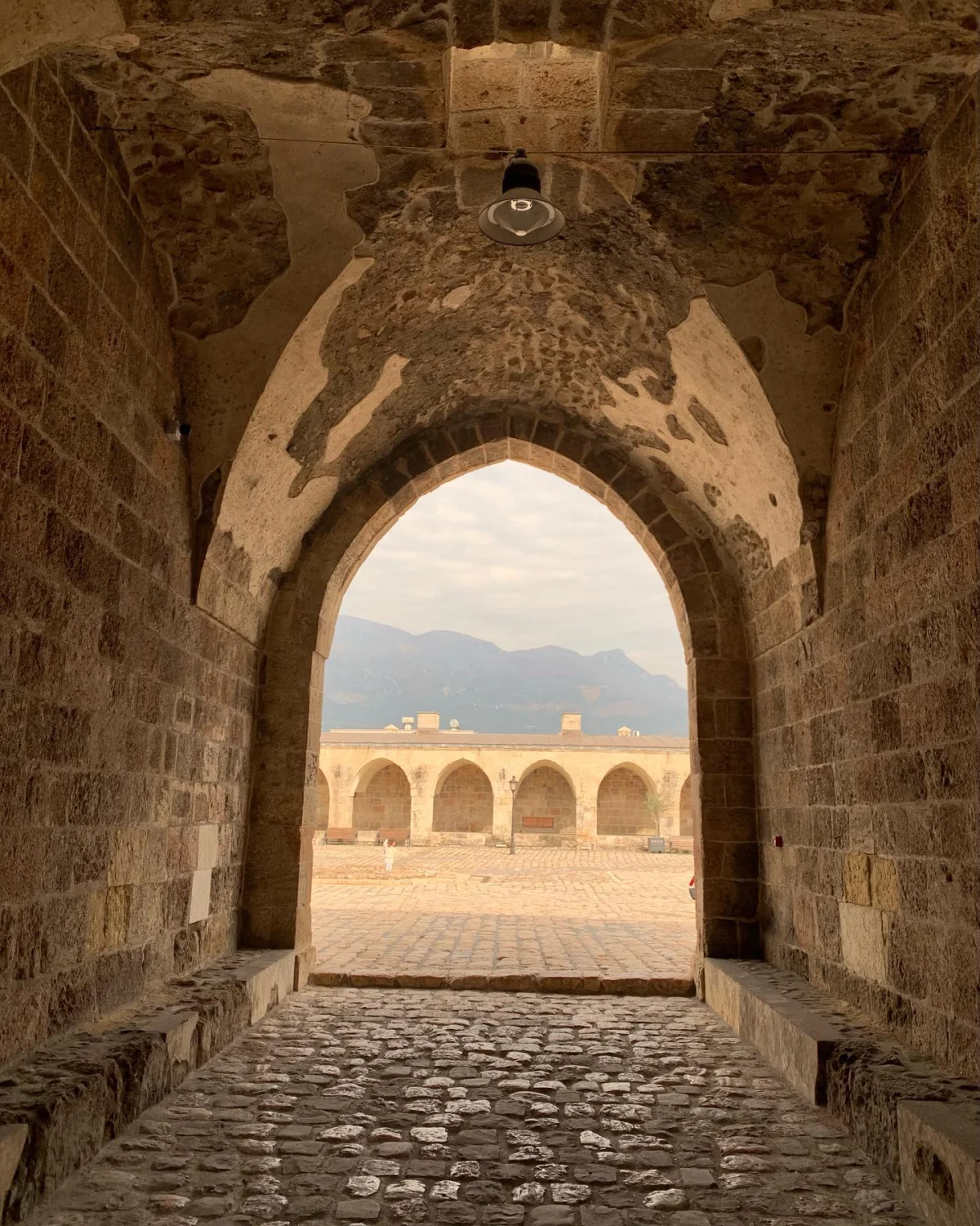 Kemerli geçidin içinden bakınca, dışarıdaki dünya farklı görünüyor. Yılların getirdiği aşınma, duvarlarda derin izler bırakmış. Bu geçitler, kalenin farklı bölümlerini birbirine bağlıyordu. Taşların her biri, geçen zamanın tanığı. Işık ve gölge oyunları, mimarinin büyüsünü artırıyor. Geçmişle bugün arasında köprü kuran bu yapılar, tarihin canlı belgeleri.