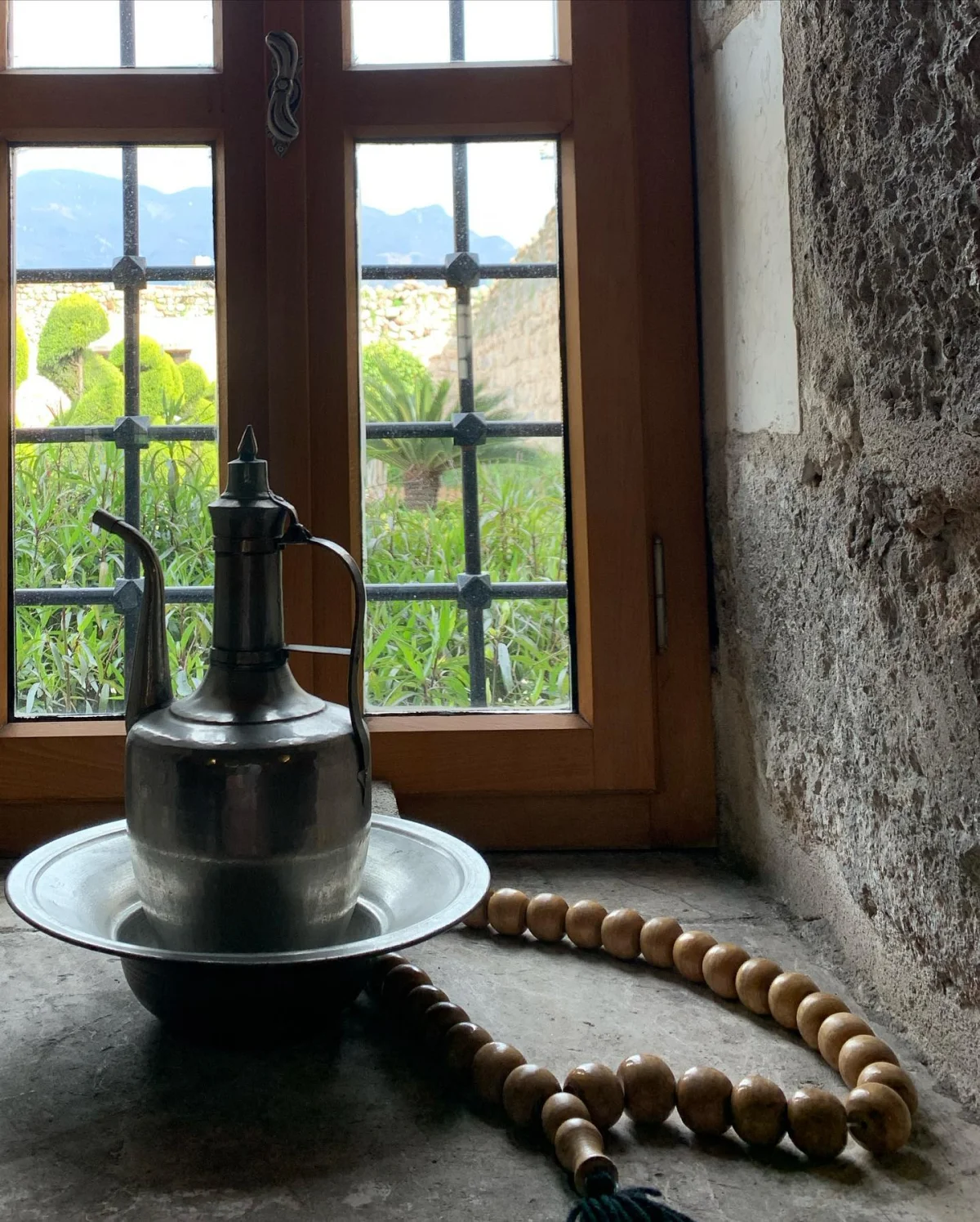 Açık pencereden süzülen ışık, metal sürahiyi aydınlatıyor. Büyükçe boncuk tesbih, o dönemin manevi yaşamını hatırlatıyor. Tepsi ve sürahi, günlük ritüellerin parçasıydı. Pencereden görünen yeşil ağaçlar, doğa ile uyumlu yaşamı simgeliyor. Bu sahnede geçmişin ruhu canlanıyor. Her obje, farklı bir hikayenin parçası.