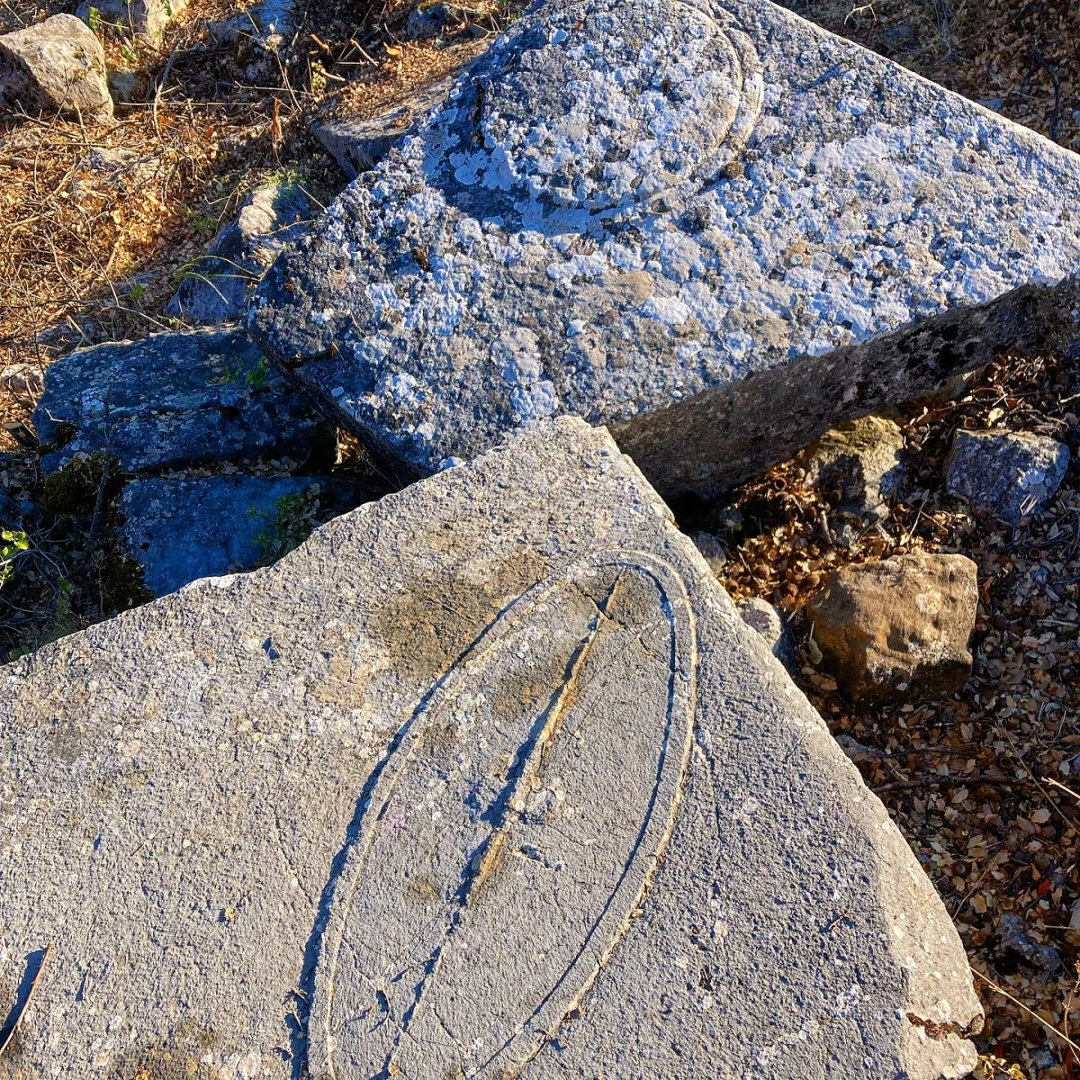 Taş bloklar üzerindeki oval şekil ve çizgiler, Roma döneminin yazıt geleneğini yansıtıyor. 1887'de G. Hirschfeld ve W.M. Ramsay'ın tanımladığı kentte, böyle semboller sıkça karşılaşılan detaylar. Helenistik dönemde Adadalı paralı askerlerin mezar taşlarında da benzer işaretler bulunmuş. Her sembol bir anlam taşıyor.