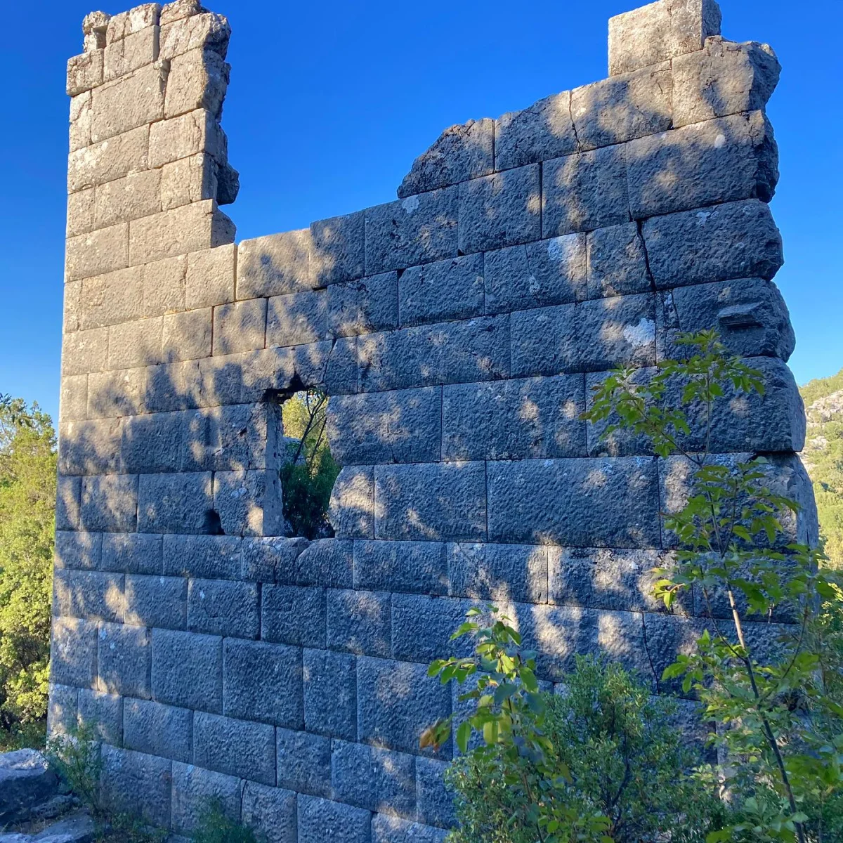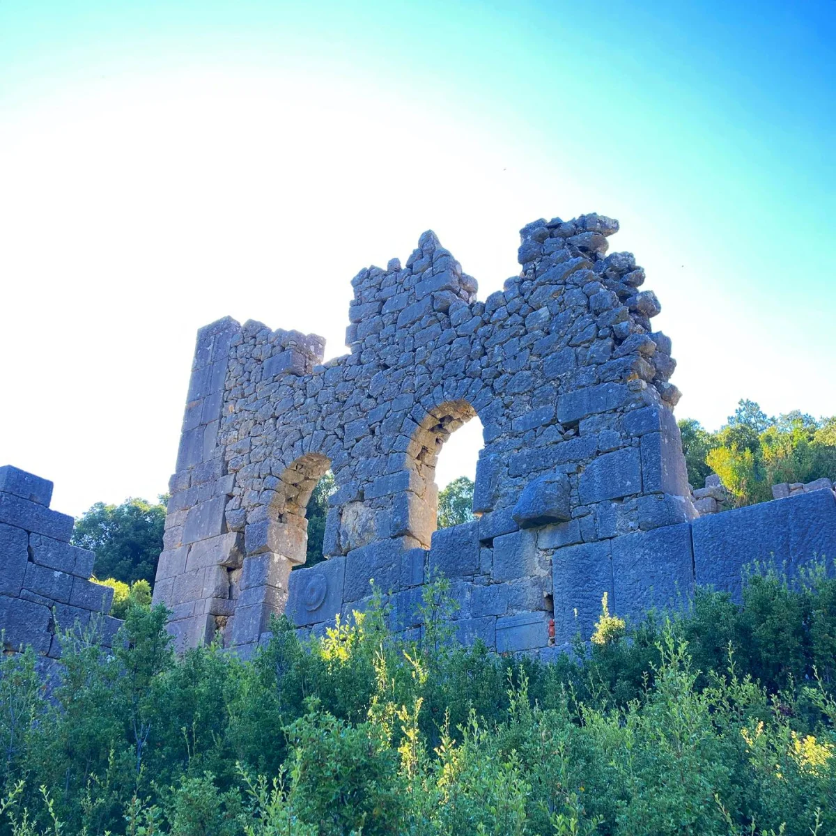 Üst üste dizilmiş büyük blokların oluşturduğu bu yan duvar, bazilikadan kalma olabilir. Roma döneminde kentin idari merkezi olan bazilika, hukuki ve ticari faaliyetlerin yürütüldüğü yerdi. Arkasındaki zengin yeşillik, antik kentin doğayla iç içe yaşadığını gösteriyor. Harabe hali bile etkileyici!