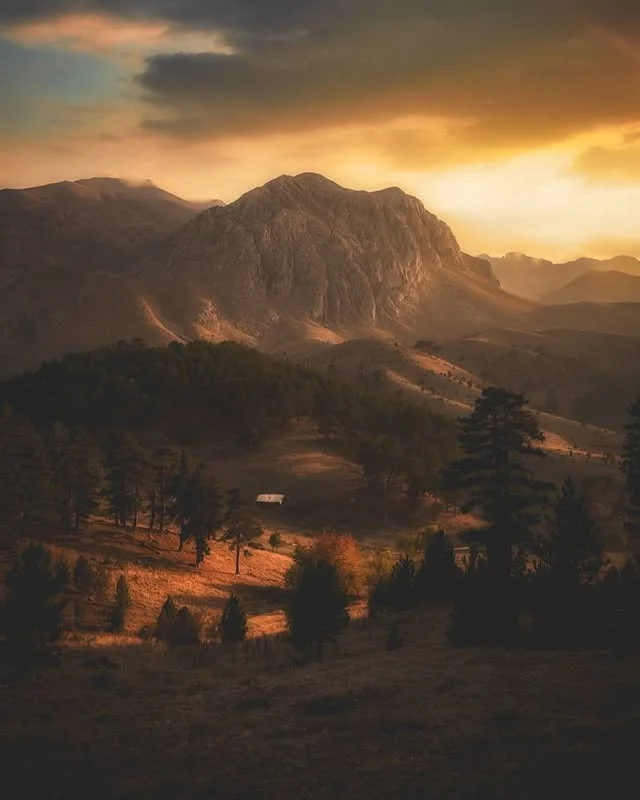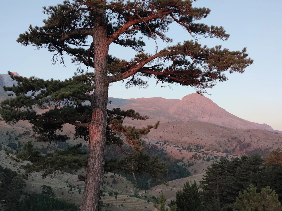 Kalın gövdeli çam ağacının arkasında uzanan dağ silsilesi, Dedegöl'ün karakteristik görünümünü oluşturuyor. Güneş ışığının yamaçlarda oynadığı oyun, bu eşsiz coğrafyanın büyüsünü artırıyor. Çam ormanları, dağın alt kotlarında yaşayan yaban hayatına ev sahipliği yapıyor. Kaya kartalı ve sakallı akbaba gibi türler, bu ağaçlarda yuva kuruyor.