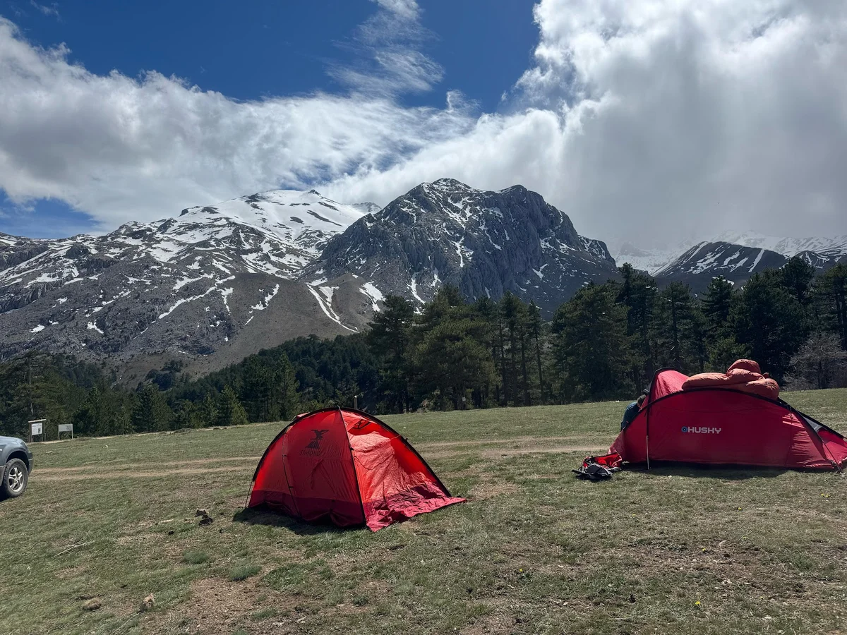 Yemyeşil çayırda kurulan çadırlar ve park edilmiş araçlar, Dedegöl maceralarının son anlarını yaşatıyor. Karla kaplı zirveler, bulutlu gökyüzüyle vedalaşıyor. Bu eşsiz dağ, her ziyaretçisine unutulmaz anılar bırakıyor. Doğanın bu muhteşem eseri, tekrar gelme arzusu uyandırıyor. Dedegöl'ün büyülü atmosferi, kalplerde iz bırakıyor. Görüşmek üzere!