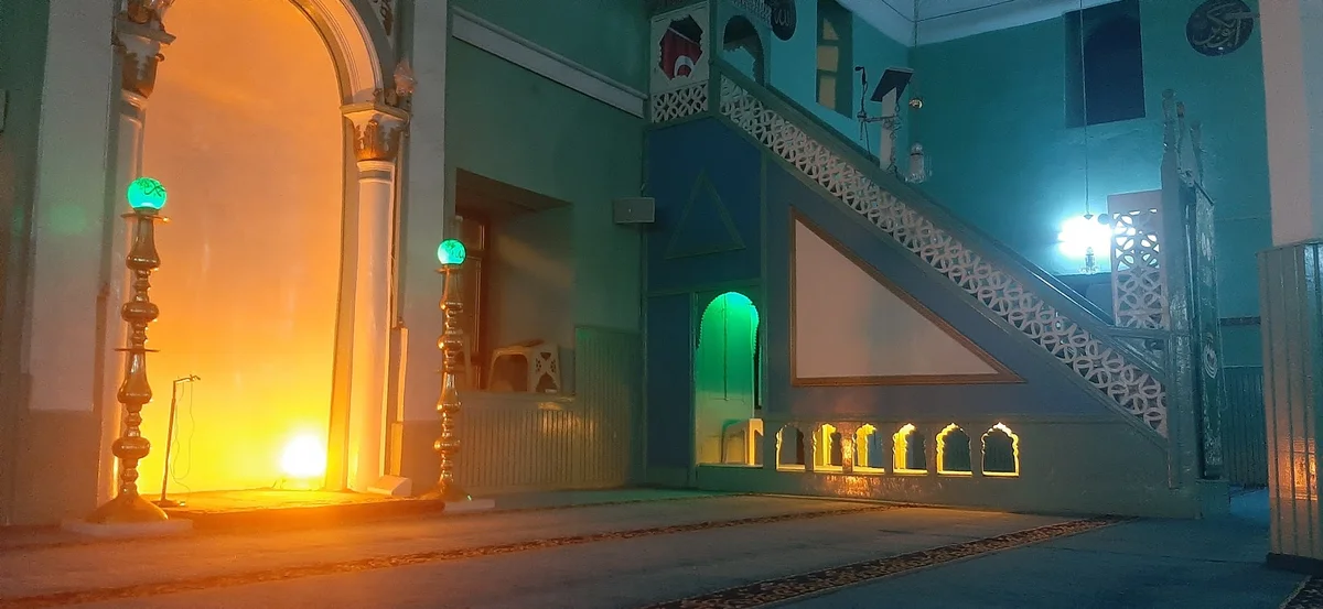 Geniş iç mekân, cemaati kucaklıyor. Duvarlar açık yeşil, tavan beyaz ve mavi desenlerle süslü. Zeminde mavi halı, yumuşak bir zemin sunuyor. Kubbe ve tavanlarda çok renkli kalem işi süslemeler, göz alıcı. Arapça yazılar: "Maşallah, Allah dilerse" ifadesi, duvarlarda parlıyor. Dört elips kubbe ve ahşap tavan, mimari zenginliği yansıtıyor. 1887'deki büyük onarımdan sonra kazandığı bu görkem, hâlâ korunuyor. İçeride tarih ve sanat, iç içe.