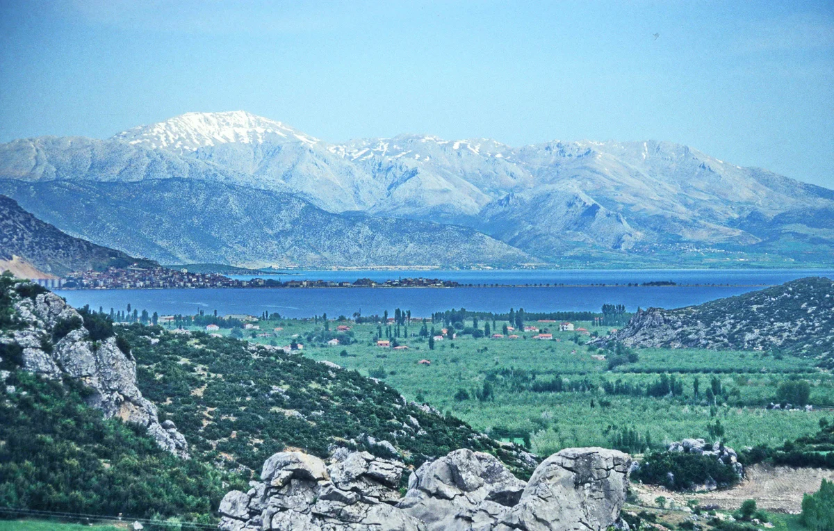 Işıkta parlayan mavi tonlar, gölün geniş su yüzeyinde dans ediyor. Arka plandaki dağlı arazinin silueti, 3-15 kilometre arasında değişen doğu-batı genişliğinin büyüklüğünü hissettiriyor. Suyun yüzeyindeki ışık oyunları, günün farklı saatlerinde değişen renk tonlarını ortaya çıkarıyor. Bu panoramik görüntü, gölün tektonik ve karstik yapının birleşimiyle oluştuğunu hatırlatıyor. Dağların üstündeki gökyüzü, tabloyu tamamlayan son dokunuş.