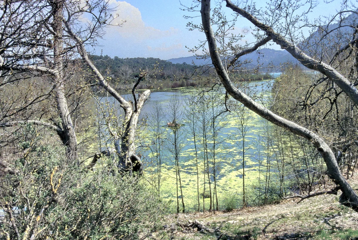 Ön plandaki ince dallar ve çalılar, gölün doğal çerçevesini oluşturuyor. Arka plandaki geniş su kütlesi, yeşil bitki örtüsüyle kaplanmış kıyılarla birleşerek doğal bir tablo sunuyor. Bu görüntü, gölün su kaplumbağası, kurbağa gibi amfibi canlıların yaşam alanını gösteriyor. Bitki örtüsünün zenginliği, ekosistemin sağlıklı olduğunu kanıtlıyor. Doğal kompozisyon, gölün her köşesinde farklı güzelliklerin saklandığını gösteriyor.
