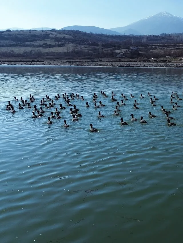 Çok sayıda ördek, suyun üzerinde gruplar halinde yüzerek gölün canlı ekosistemini sergiliyor. Arka plandaki dağlar ve yeşil alanlar, kuşların doğal habitatını tamamlıyor. Bu görüntü, gölün göçmen kuşlar için önemli bir durak noktası olduğunu gösteriyor. Ördeklerin su üzerindeki hareketliliği, doğal yaşamın dinamizmini yansıtıyor. Huzur verici atmosfer, kuş severlerin bu cennet köşesinde saatlerce vakit geçirebileceğini gösteriyor.