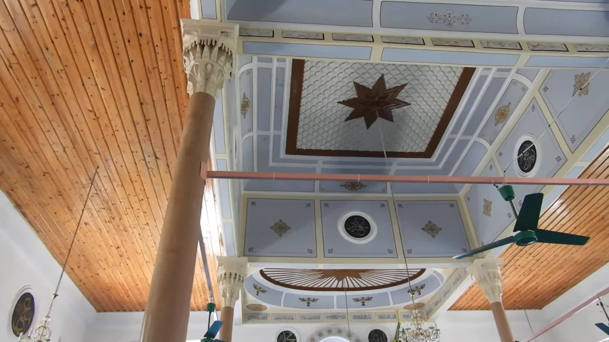 Süslü tavan yapısı, açık mavi ve beyaz tonlarında bir sanat eseri. Geometrik desenler, İslam sanatının inceliğini yansıtıyor. Merkezde büyük bir yıldız figürü, gökyüzünü içeri taşımış gibi. Her desen, ustanın elinin izini taşıyor. 1924'teki yeniden yapımda bu detaylar özenle korunmuş. Atabey'in bu yapısında tavan, sadece bir örtü değil, yukarıya açılan bir pencere. Müftü Mahallesi'nde bu sanat, yüzyıllardır aynı güzellikte duruyor.