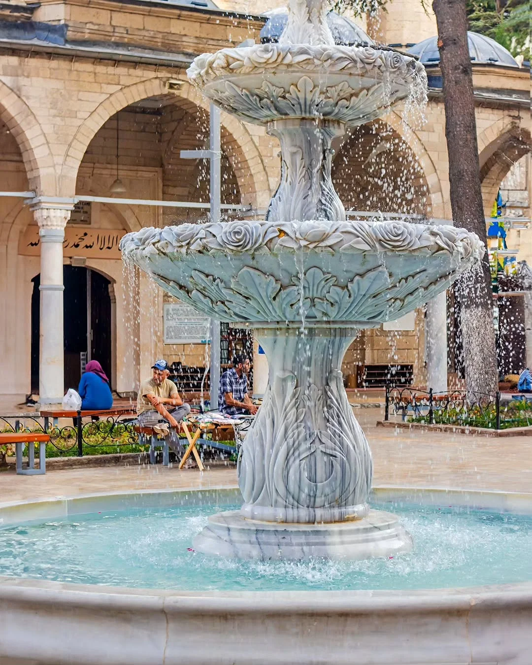 Mermerden işlenmiş çeşme, avlunun incisi. İki katlı yapısından fışkıran su, temizlik ve bereketin simgesi. Yeşil bitkilerle çevrili bu alan, abdest alan müminlere huzur veriyor. Çevresinde oturan insanlar, suyun şırıltısını dinleyerek rahatlıyor. Osmanlı döneminin çeşme sanatının güzel örneği olan bu yapı, fonksiyonelliği ile estetiği birleştiriyor. Su sesi, kalplerdeki huzuru artırıyor.