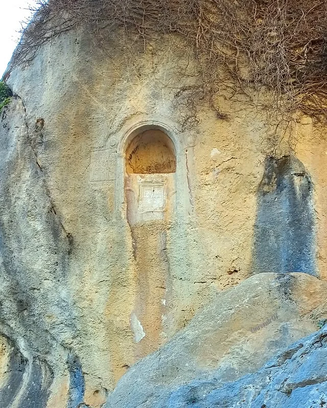 Kayalık yüzeye oyulmuş bu niş, ostoteklerin (kül kapları) yerleştirildiği kutsal alanlardan biri. Üzerindeki sarmaşık benzeri bitkiler, doğanın bu kutsal mekanı nasıl koruduğunu gösteriyor. Bu nişler, nekropolis bölümünün önemli parçaları olarak mezar sahiplerinin anısını yaşatıyor. Her oyuk, bir yaşamın son durağı.