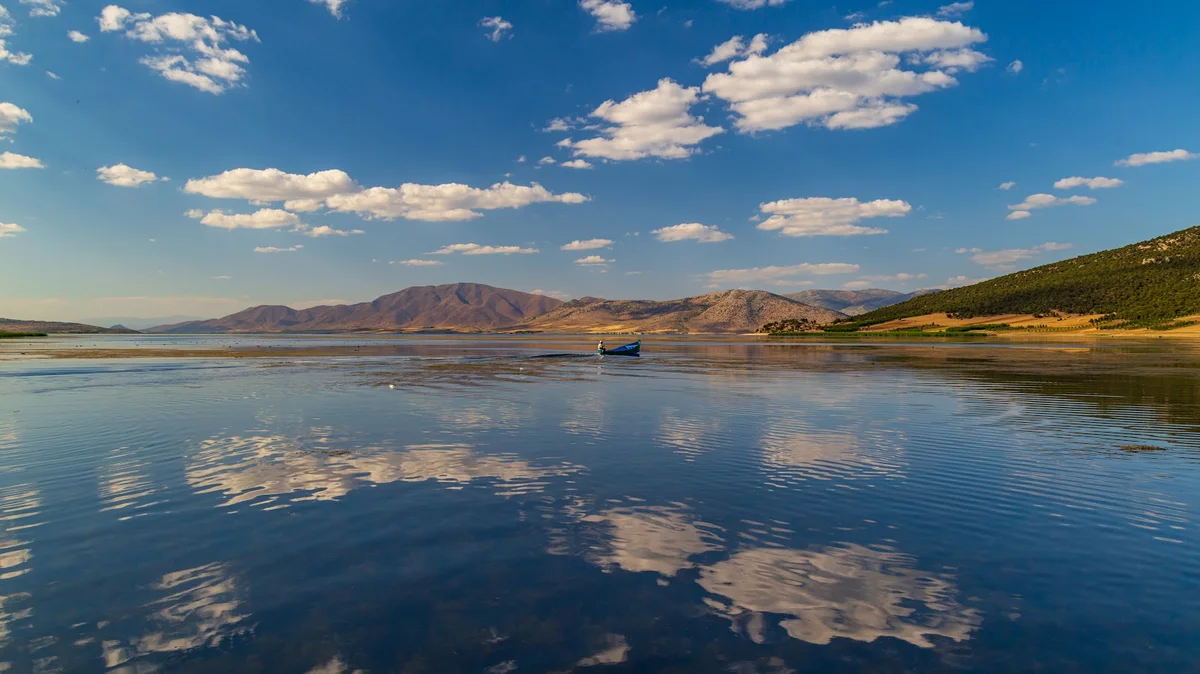 Cam gibi durgun sular üzerinde bulutların yansıması, Beyşehir Gölü'nün büyüleyici atmosferini ortaya koyuyor. Açık mavi gökyüzü altında uzanan bu sakin yüzey, adanın etrafını çeviren doğal sınırları oluşturuyor. Kışın donduğunda yürüyerek geçilebilen bu sular, yazın tekne ve dubalarla ulaşım sağlıyor. 700-800 metre uzaklıktaki kıyıdan adaya uzanan yolculuk, huzurun kapılarını aralıyor.