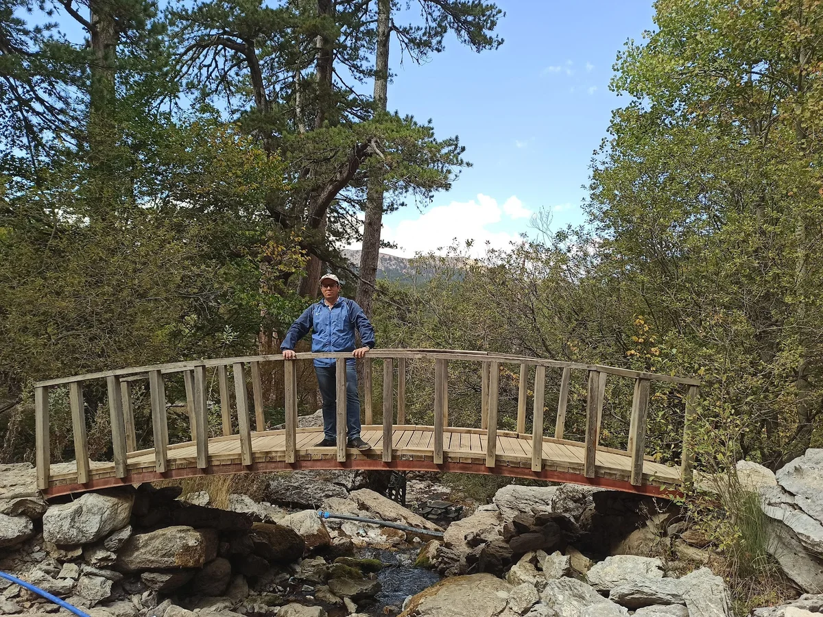 Çaydere Ormanları'nın kalbinde, ahşap köprü doğayla uyum içinde duruyor. Mavi giysili gezgin, Pınargözü'nün dış güzelliklerini keşfederken, altından akan suyun sesi kulakları okşuyor. Yeşil ağaçların gölgesi altında, mağaranın giriş bölgesine yaklaşım başlıyor. Köprü, Yenişarbademli'nden 8 kilometre uzaklıktaki bu doğa harikasına saygılı bir geçiş sunuyor. Etraftaki sessizlik, içeride bekleyen büyük keşfin heyecanını artırıyor. Doğal ahşap malzeme, çevresel dengeyi koruyan yaklaşımı yansıtıyor.