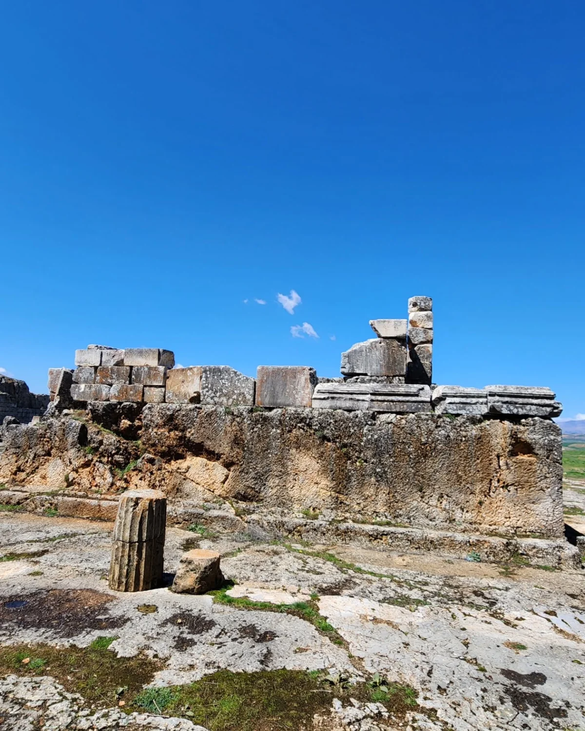 Uzun ve ince taşlardan oluşmuş duvarlar, antik yapı tekniklerinin çeşitliliğini ortaya koyuyor. Açık mavi gökyüzü altında belirgin şekilde görünen bu kalıntılar, farklı dönemlerin izlerini taşıyor. Bazı taşların düşmüş olması, zamanın etkisini gösteriyor. Duvar örgüsünün sistematik yapısı, planlı inşaat sürecini yansıtıyor. Her taş, antik ustaların titiz çalışmasının kanıtı.