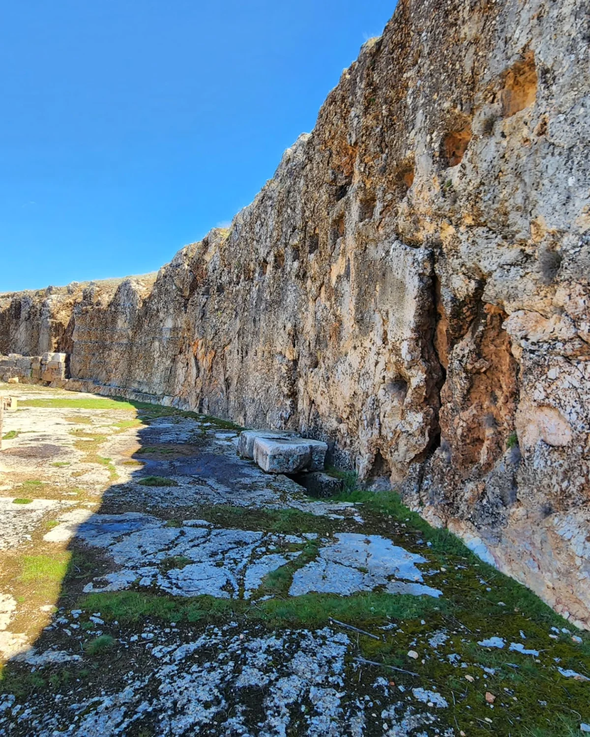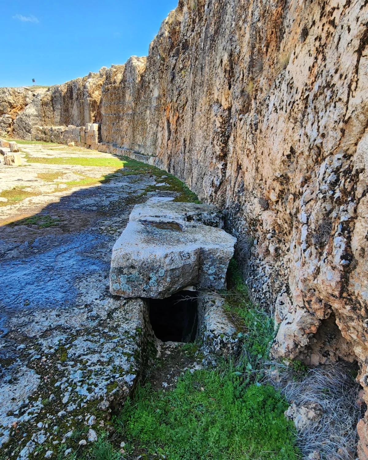 Büyük taş duvarın yanındaki yuvarlak boşluklu düz blok, antik mimarinin gizemli detaylarından biri. Bu tür özel işlenmiş taşlar, kentin önemli yapılarında kullanılırdı. Doğal taşlardan yapılmış yüksek duvar, kentin sınırlarını belirliyordu. Taş işçiliğinin inceliği, Roma döneminin sanat anlayışını yansıtıyor. Her detay, geçmişin ustalık hikayesini anlatıyor.