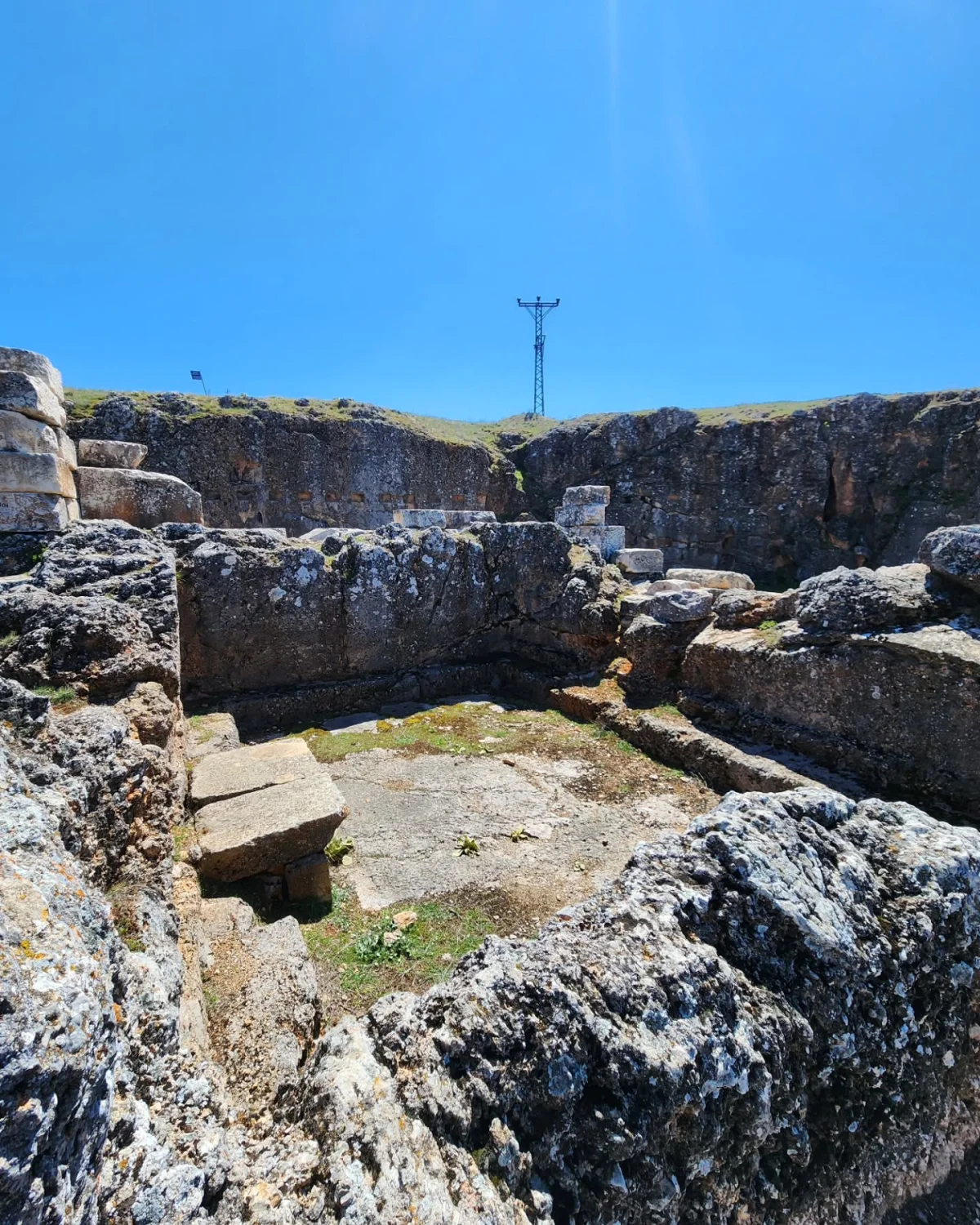 Büyük ve düzensiz taşlar arasında yeşeren bitkiler ve yosunlar, doğanın zamanla nasıl sahiplendiğini gösteriyor. Mavi gökyüzü altında uzanan bu alan, antik kentin doğayla uyumunu yansıtıyor. Taş yapıların arasından çıkan yeşillik, yaşamın sürekliliğini simgeliyor. Yosunların kapladığı yüzeyler, nemli iklimin etkilerini taşıyor. Doğal güzellik ve tarih, el ele yürüyor.